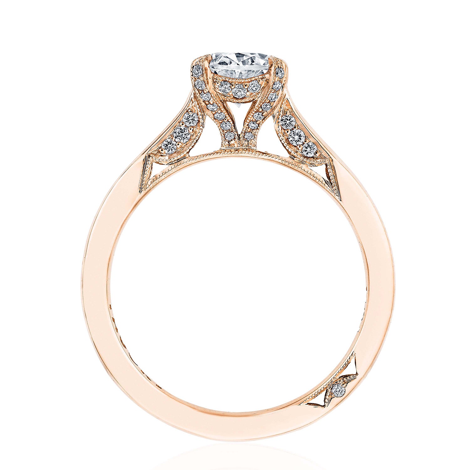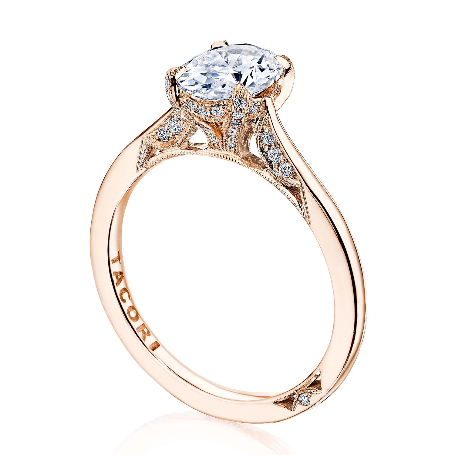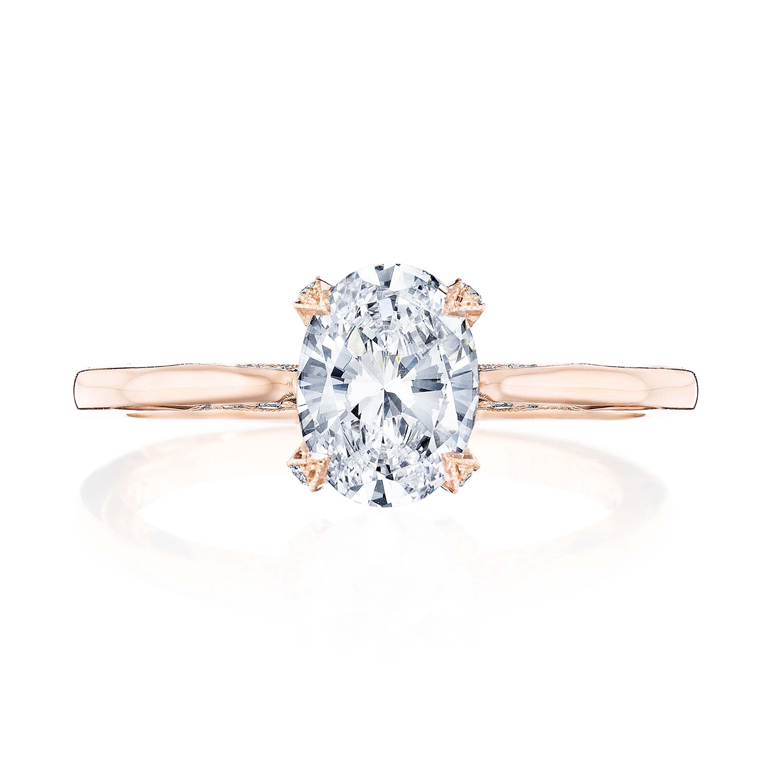 Delicate details and a dainty Cathedral foundation. This Simply Tacori solitaire features an effortlessly modern, hi-polish ceiling and oval cut center.