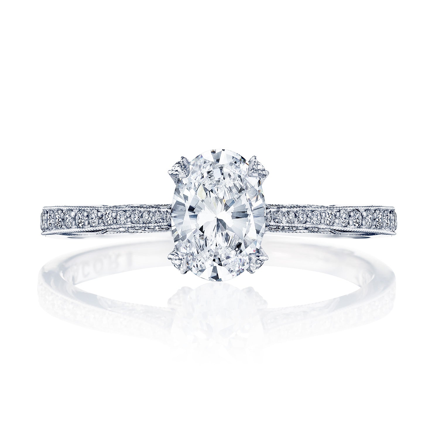 Delicate details and a dainty Cathedral foundation. This Simply Tacori solitaire features a high shine pavé diamond ceiling and oval cut center.
