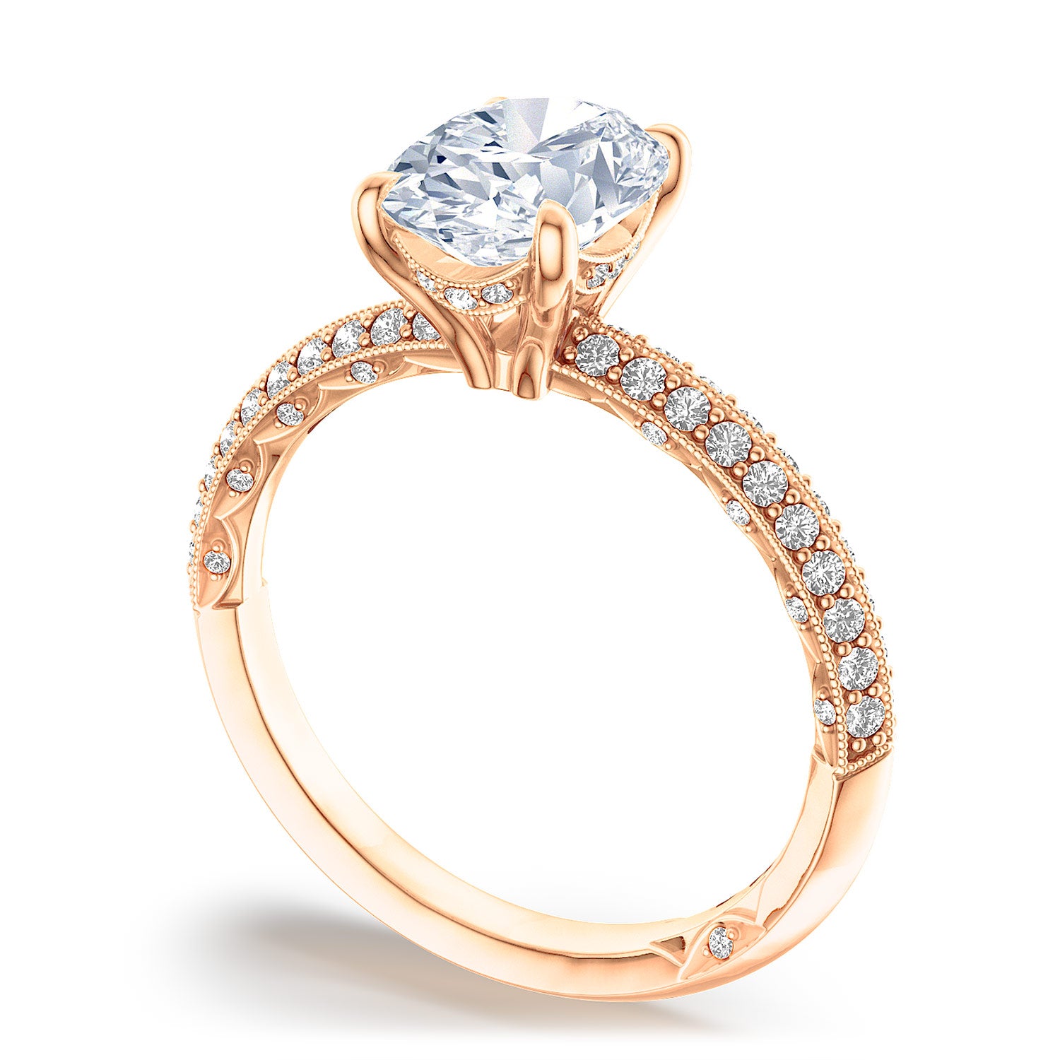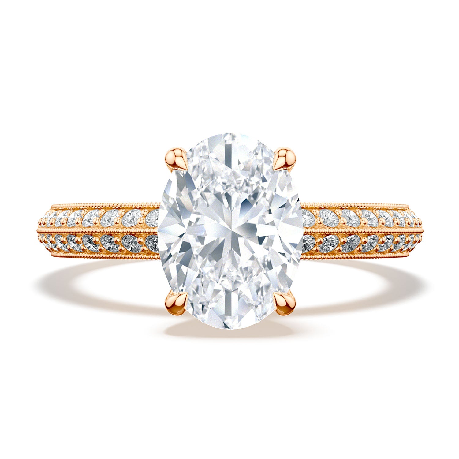 This Knife Edge engagement ring reimagines this classic silhouette with delicate hidden crescents and a beautiful array of pavé diamonds emphasizing the size of the center stone.