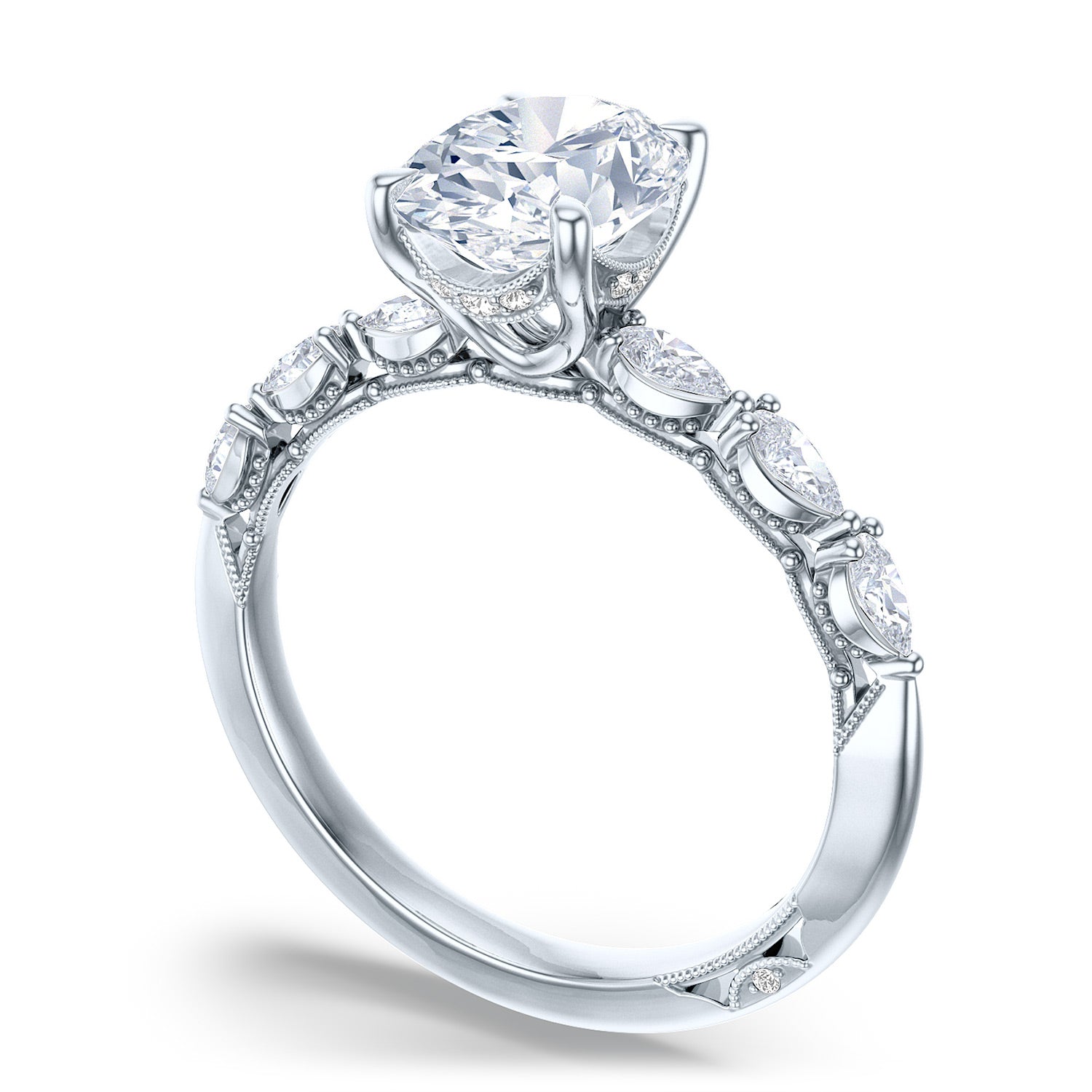 This intricately detailed engagement ring puts a spotlight on pear-shaped diamonds. Diamond accents and beading enhance an elegant crown with hidden bloom detail and a Sculpted Crescent inner face with crescent signature at the resting point.
