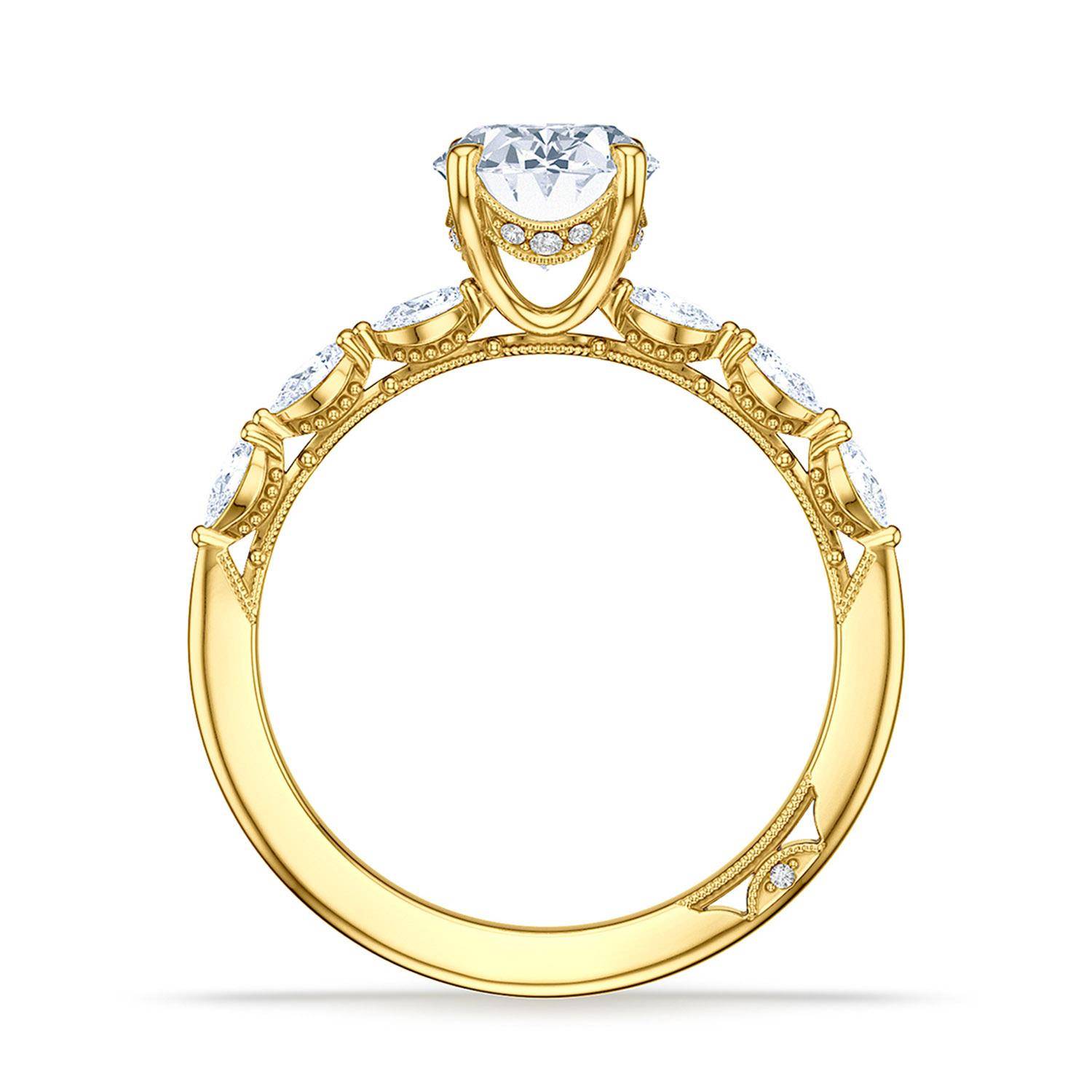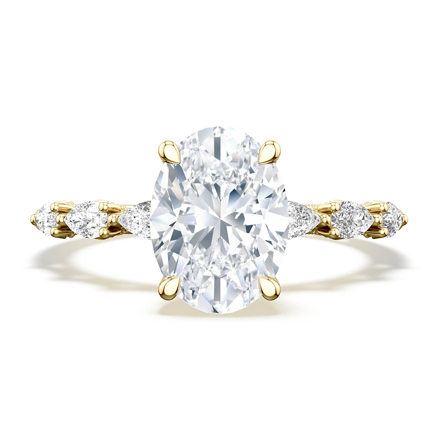 This intricately detailed engagement ring puts a spotlight on pear-shaped diamonds. Diamond accents and beading enhance an elegant crown with hidden bloom detail and a Sculpted Crescent inner face with crescent signature at the resting point.