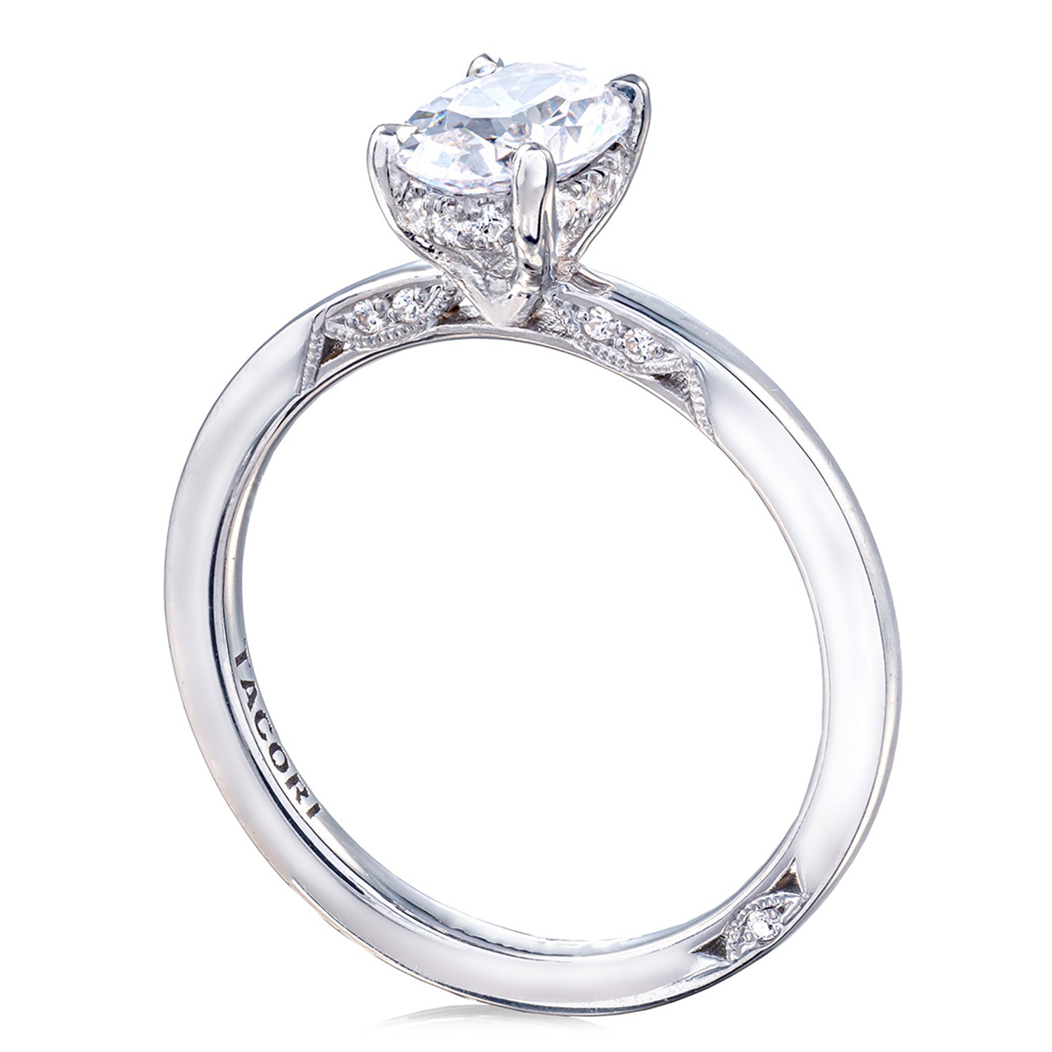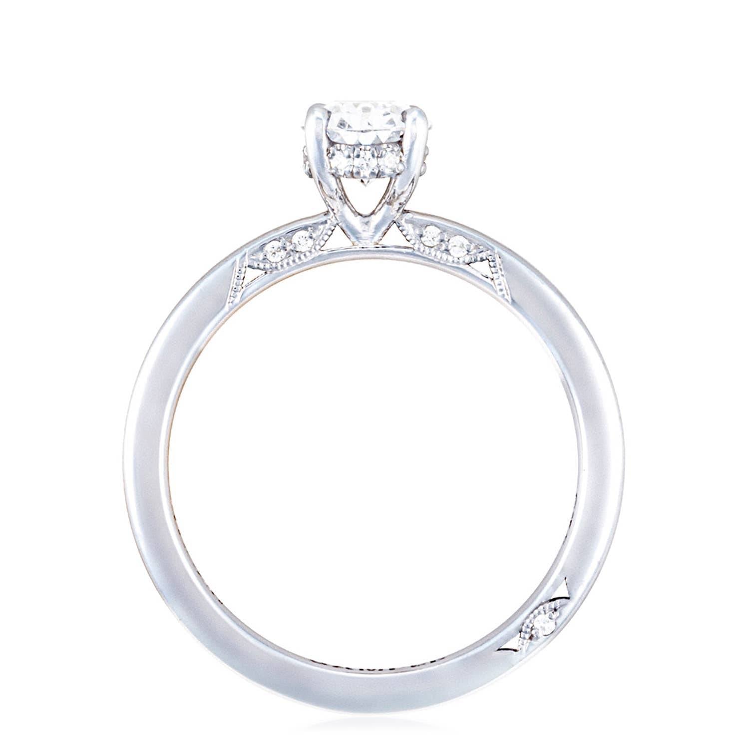Features a Classic 360 foundation with a high polish finish. The iconic Simply Tacori crescent fabric decorates the ring with delicate diamond and milgrain detailing, while a hidden bloom beneath the crown adds an all-angles sparkle.