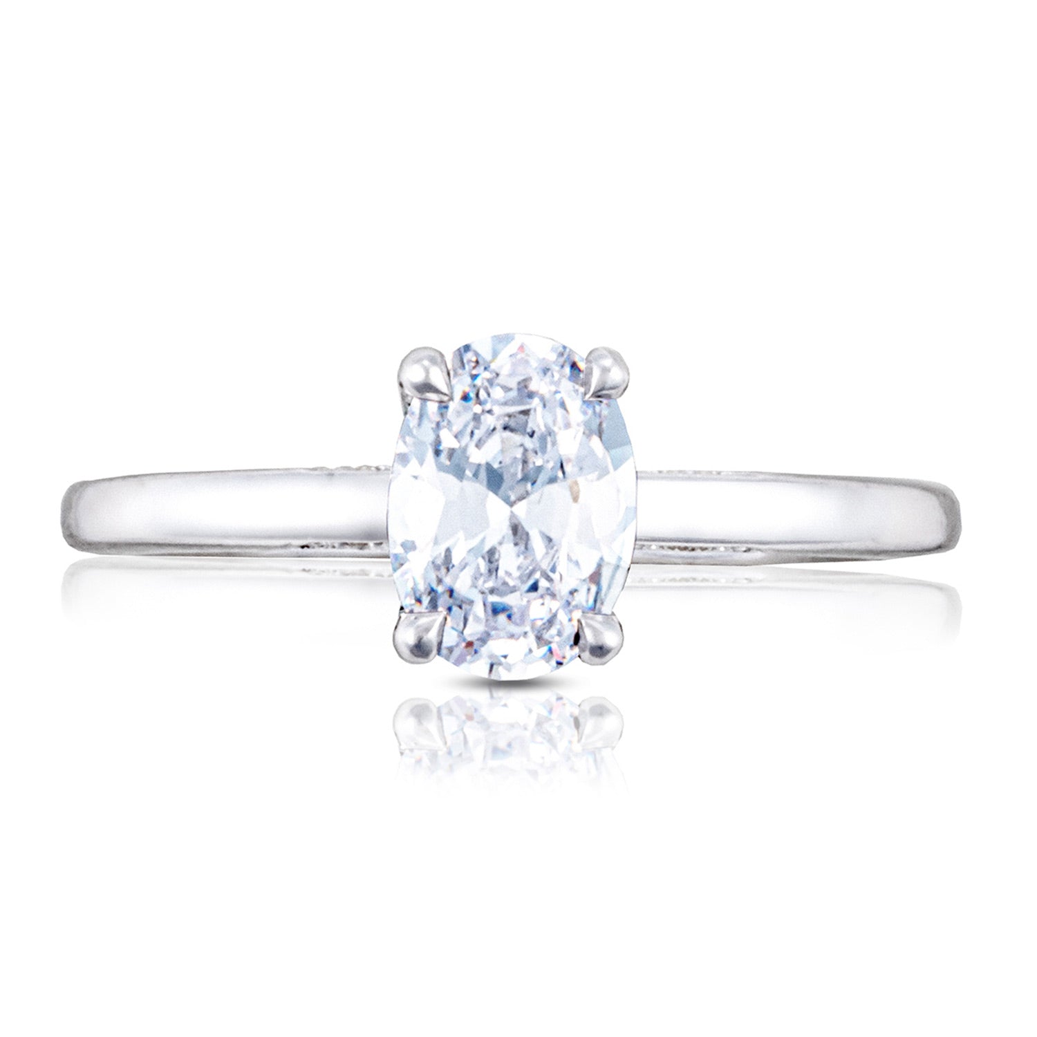 Features a Classic 360 foundation with a high polish finish. The iconic Simply Tacori crescent fabric decorates the ring with delicate diamond and milgrain detailing, while a hidden bloom beneath the crown adds an all-angles sparkle.
