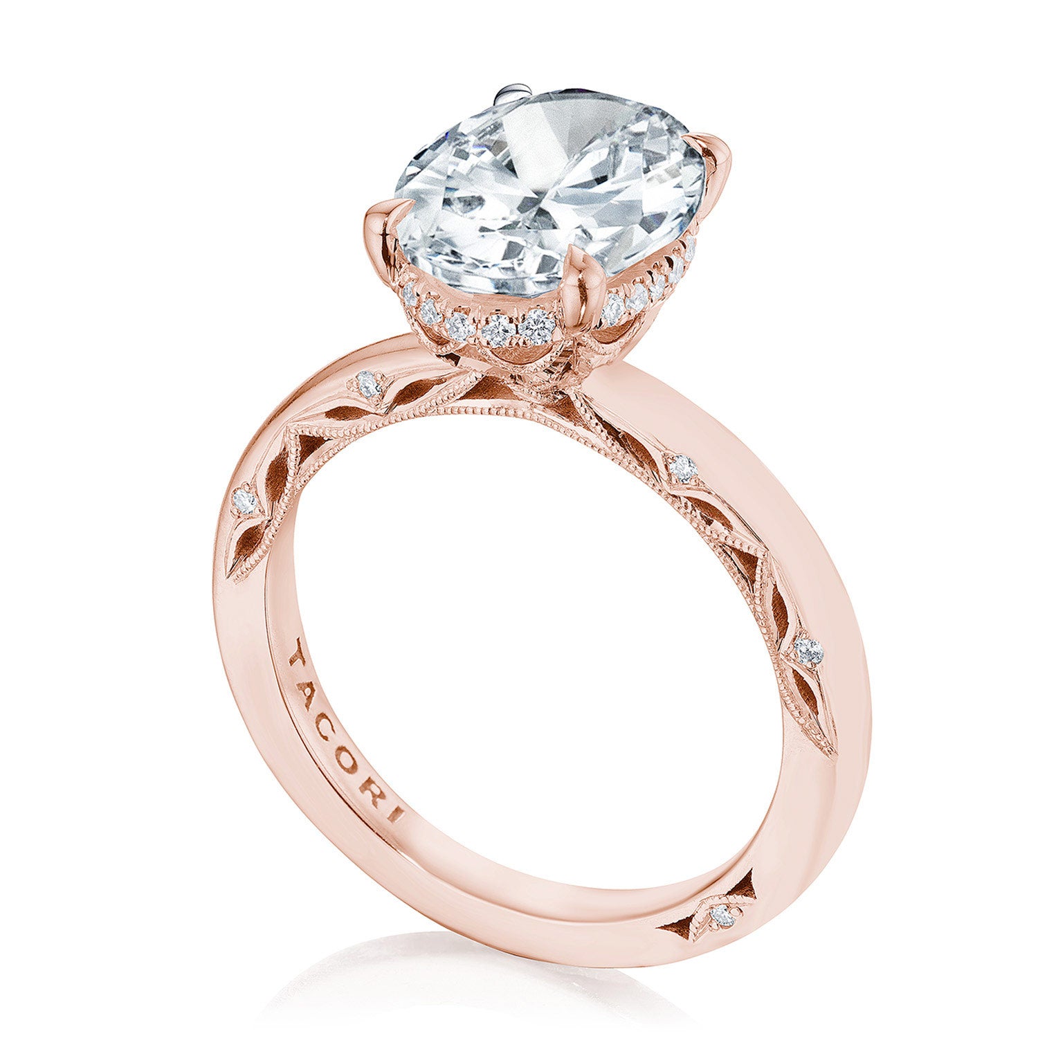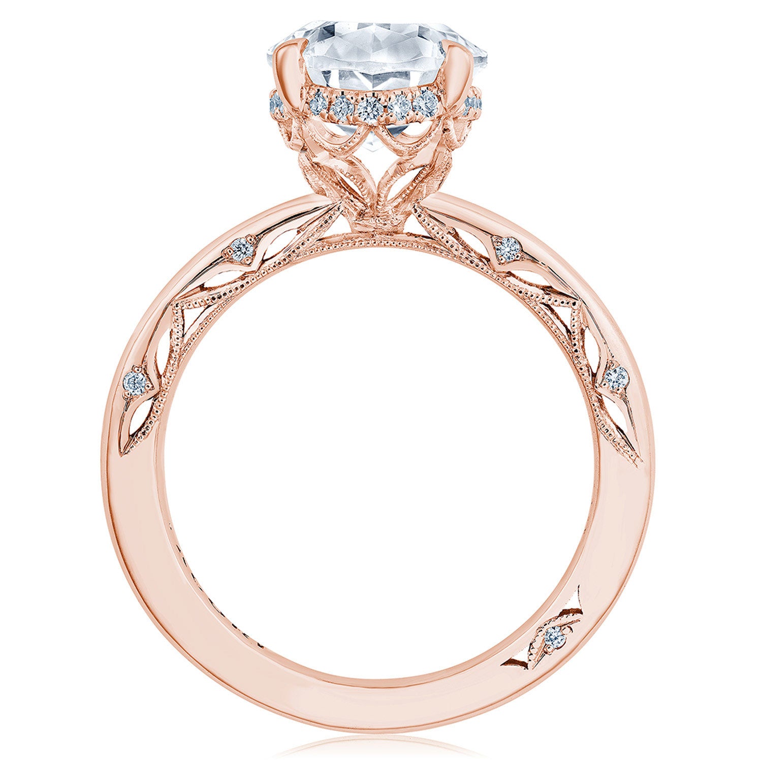 A high-polish ceiling accented with lace-like tracery makes for a stunningly airy setting. The hand-hewn milgrain and pinpoint diamonds add nuance, while a hidden bloom creates dimensional light. A Signature Crescent marks the resting point.