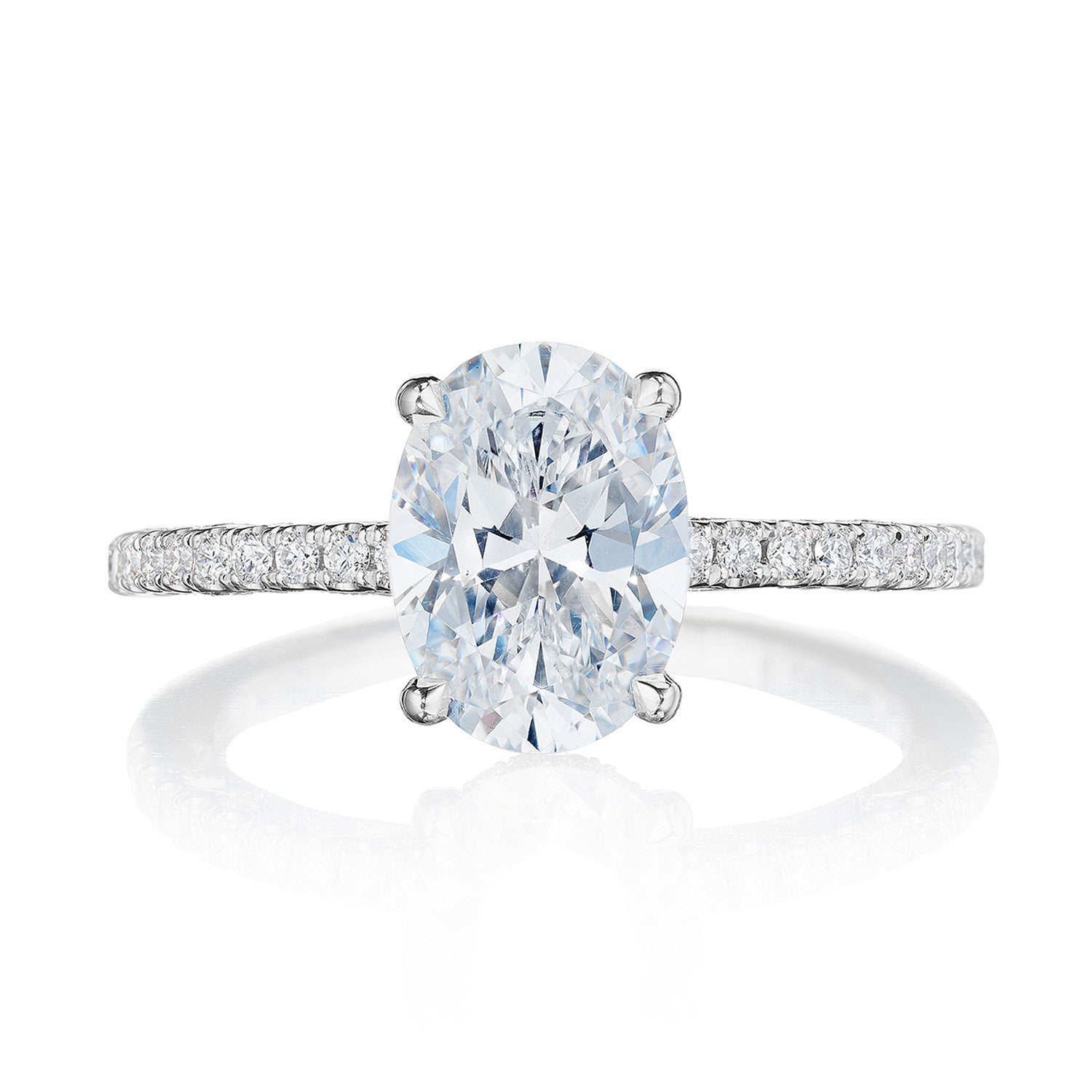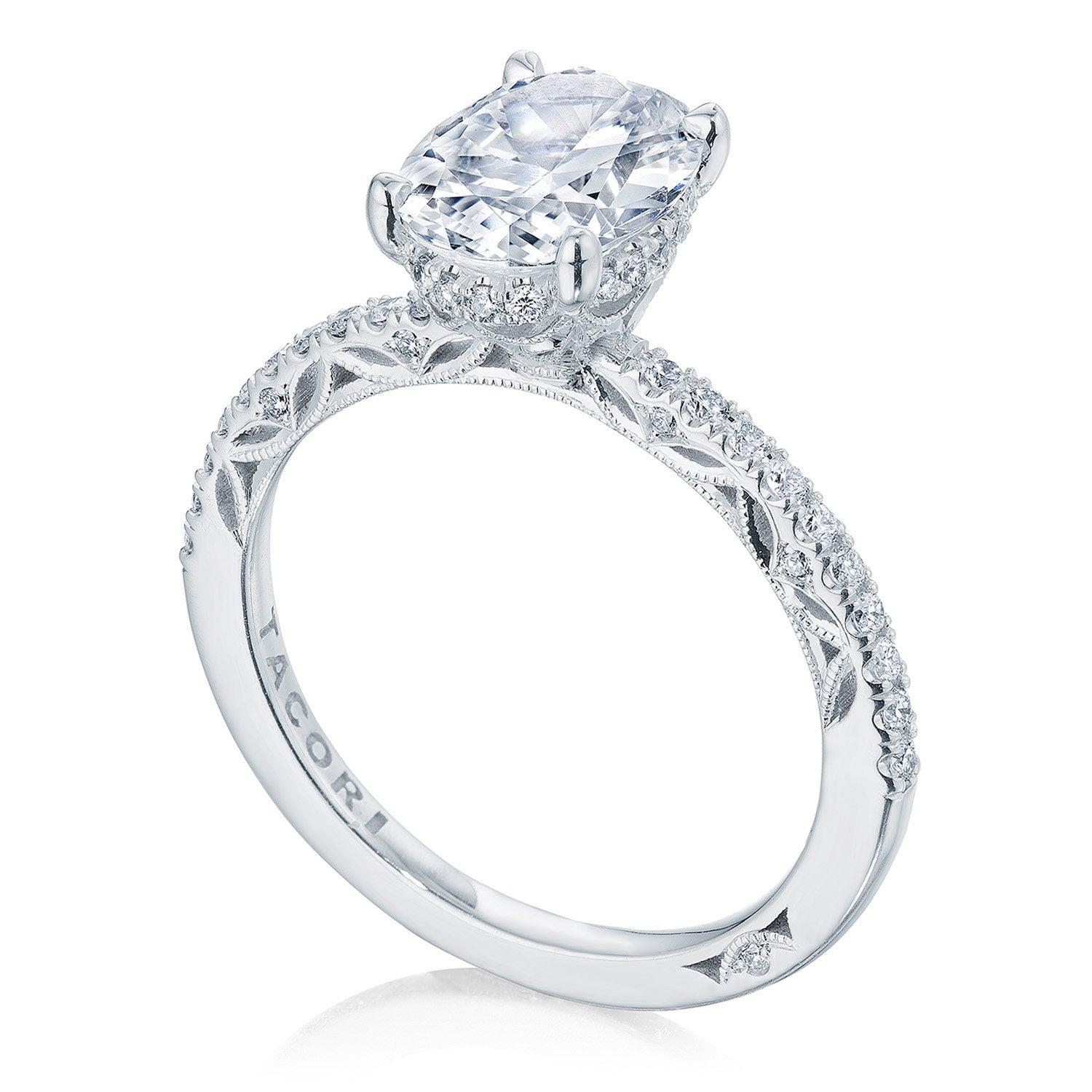 A French pavé ceiling adds dimensional light, while a hidden bloom and open air crown work illuminates the center stone. A complex and alluring lace-like Crescent Fabric gives stunning texture to the inner face profile.