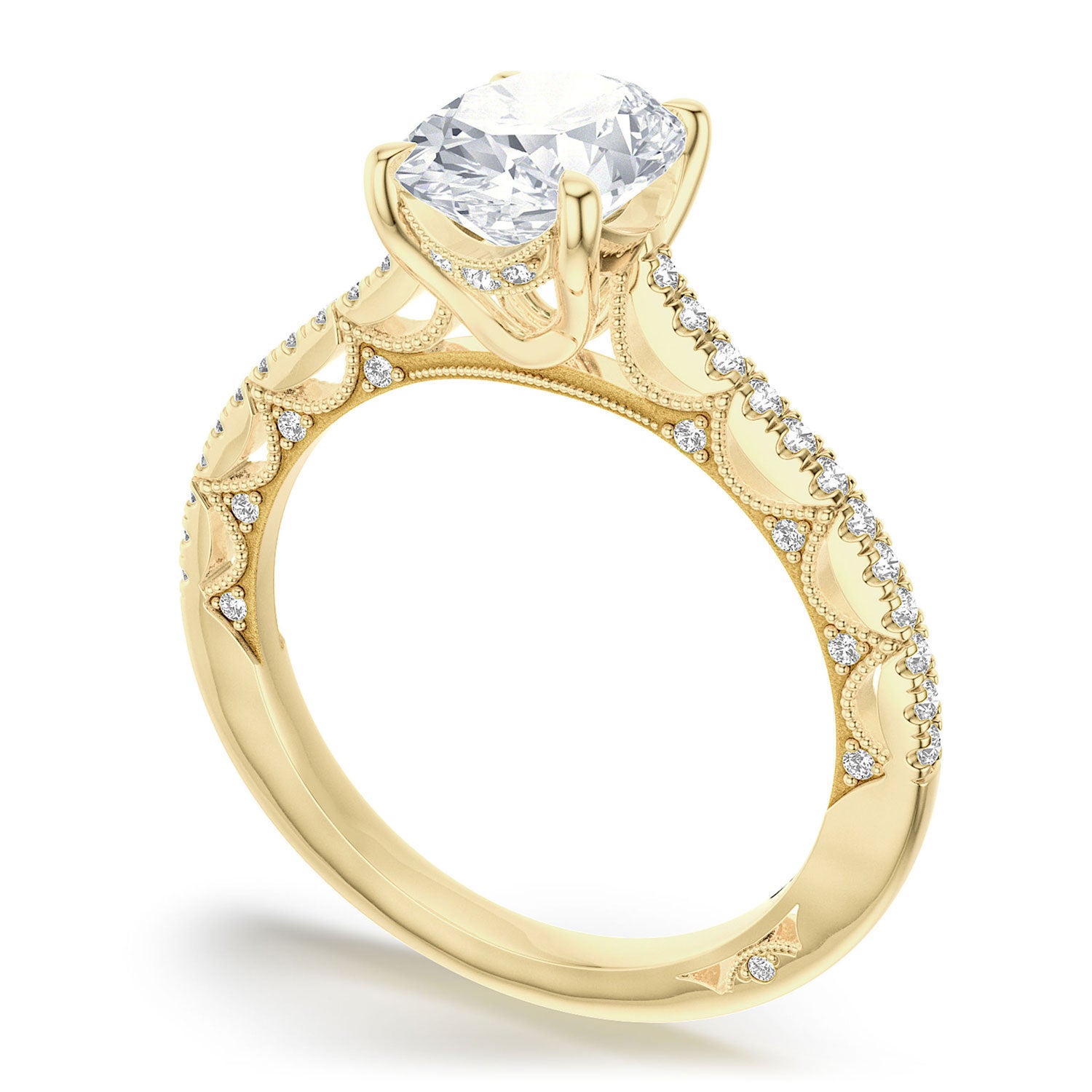 Milgrain-edged Crescents glow across the inner face, while round-brilliant diamonds, hand-set with triple beading, add radiance. A pave ceiling traces towards the center stone, which sits above a hidden bloom on a Cathedral foundation.