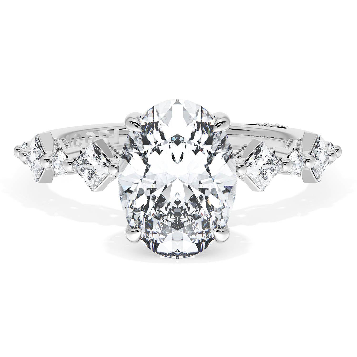 An Oval Solitaire is set into an 18kt White Gold foundation. Alternating carré and round brilliant diamonds trace up the ceiling and hand-hewn beading adds texture to the silhouette.