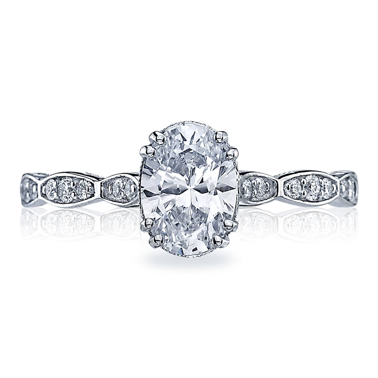 Oh-val delight! The oval shaped center diamond is complemented with brilliant round diamonds scattered within unique marquise shaped designs. With crisp double prongs securing the oval shaped diamond, this one-of-a-kind engagement ring will sparkle anyway you look at it. Let this heirloom inspired ring be a stunning testament to your endless love.