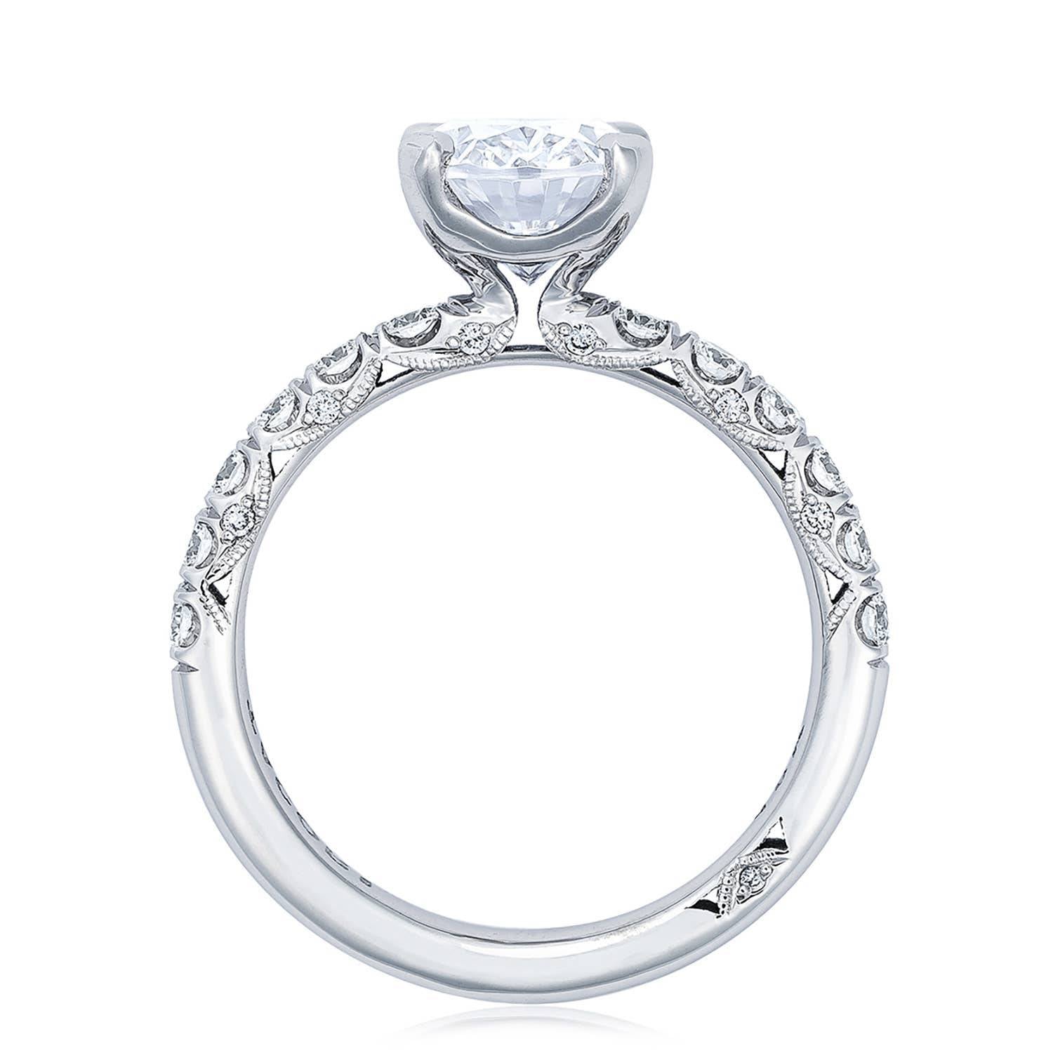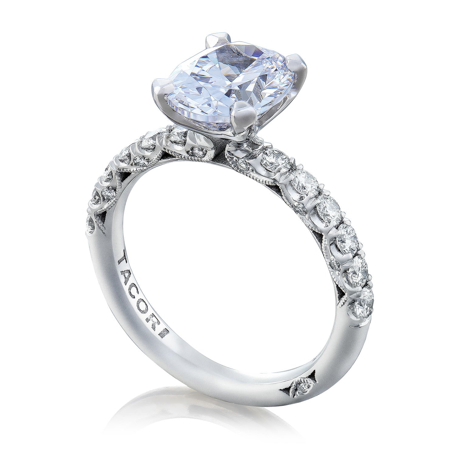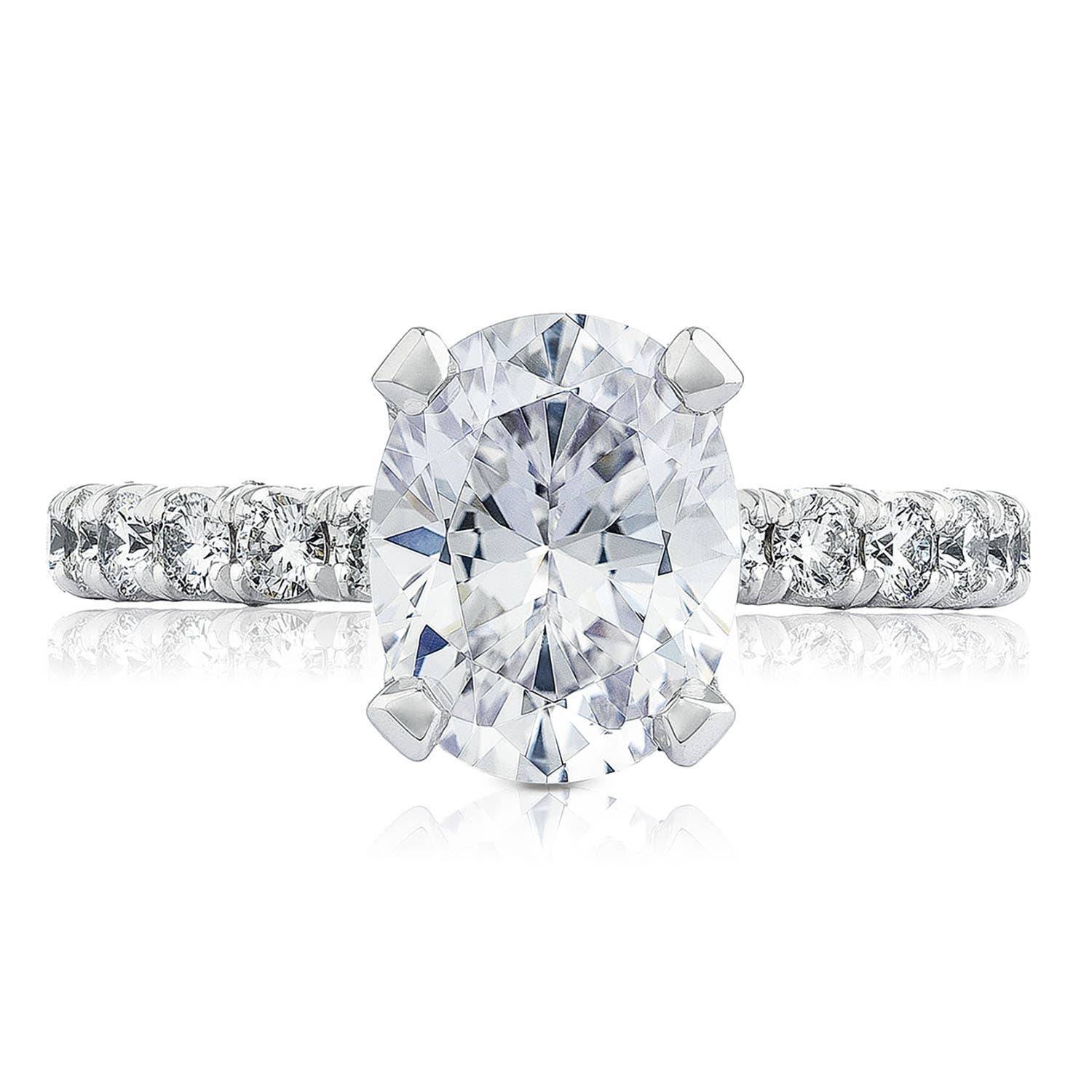 With a French cut setting, there is less metal so that all of the diamonds on the 2.5mm foundation shine brighter and reveal the beauty of the oval center.