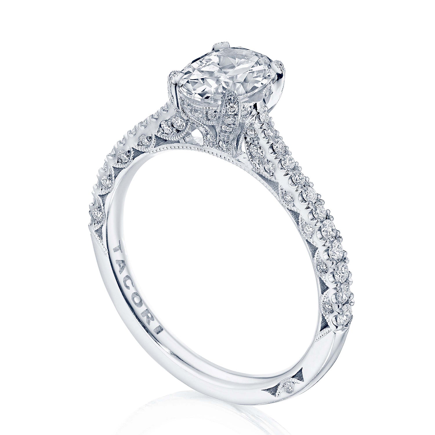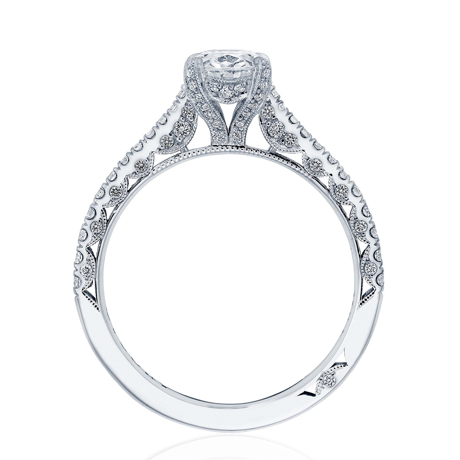 Pave-set diamonds are tapered along the ceiling, leading to a center solitaire set with diamond-studded prongs of a Cathedral foundation. A hidden bloom adds sparkle beneath the crown, and Petite Crescent decorates the innerface.