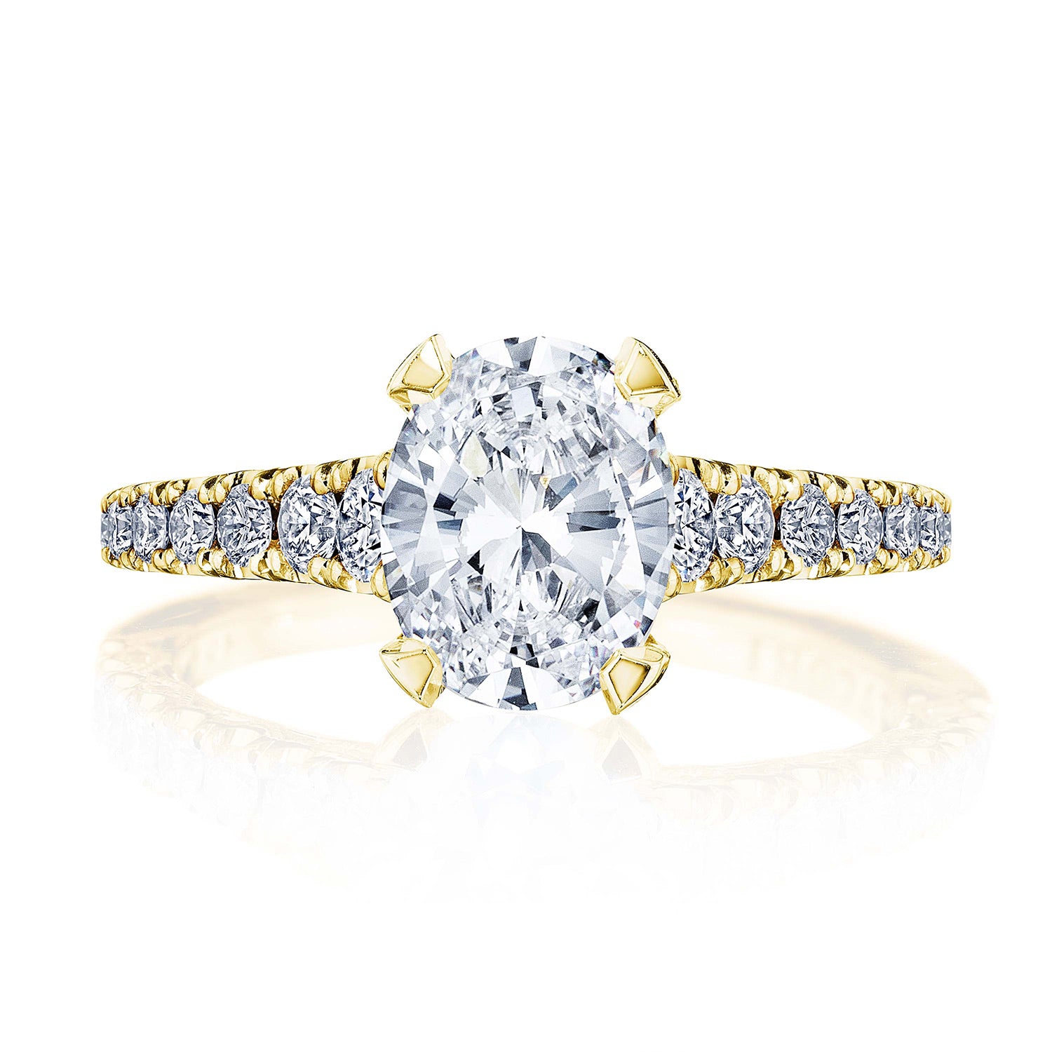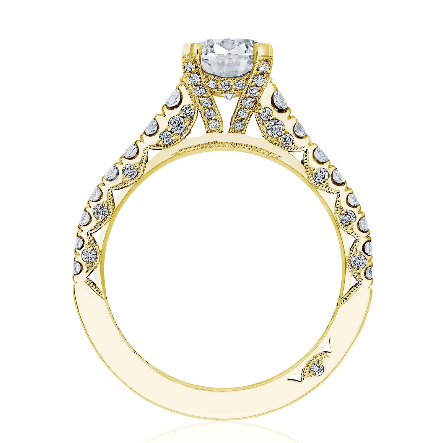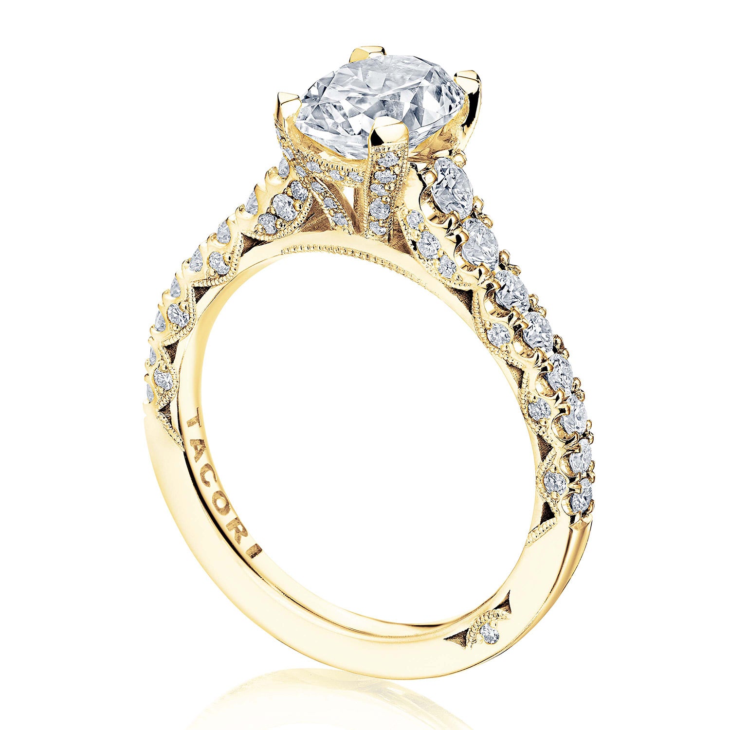 Tapering pavé-set diamonds lead up the ceiling towards the center stone, which is set on a diamond-studded Cathedral foundation above a hidden bloom and a band of Petite Crescent fabric. A Signature Crescent marks the foundation of the ring.