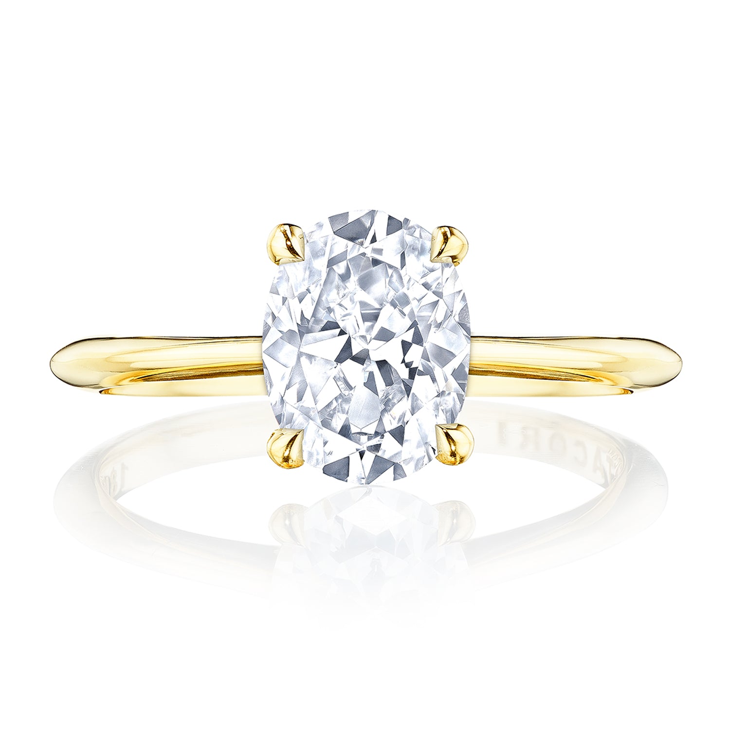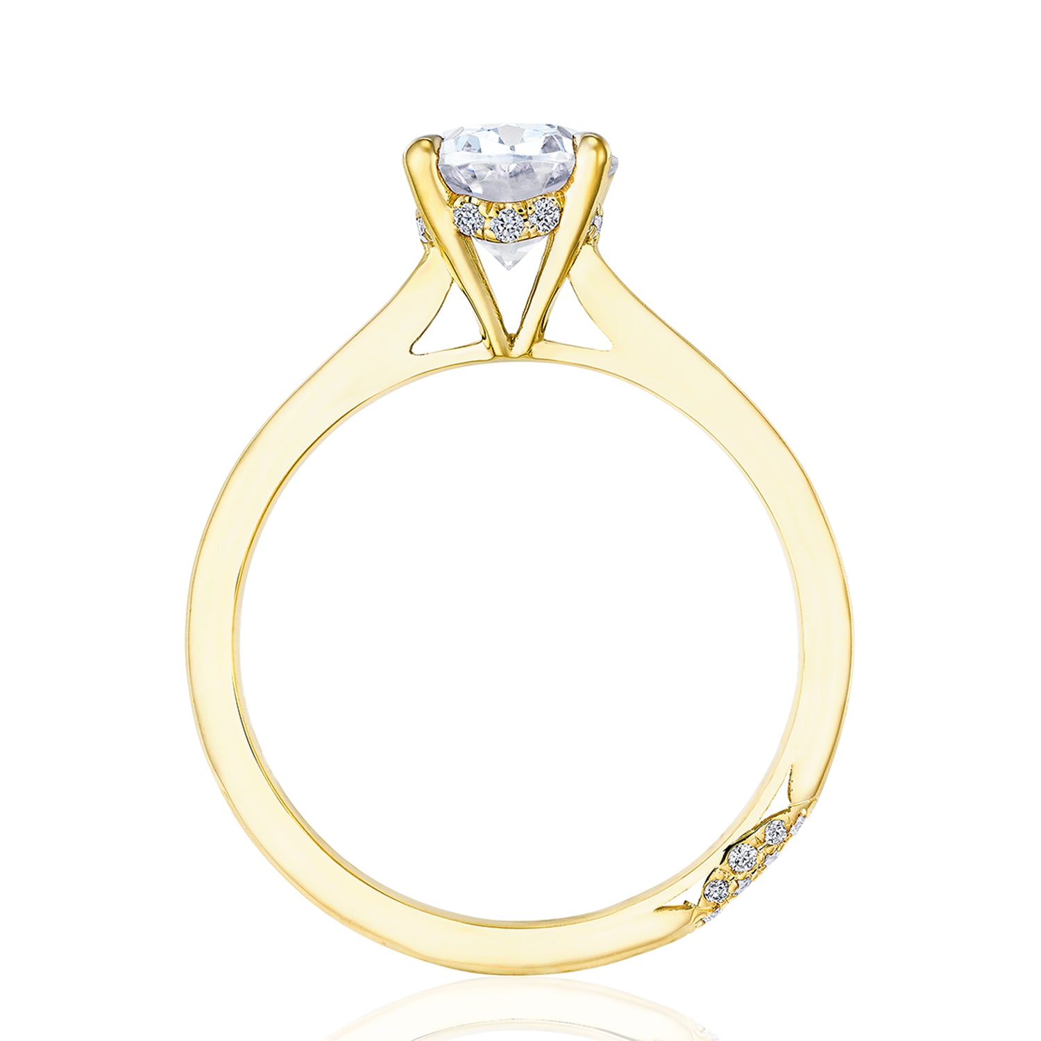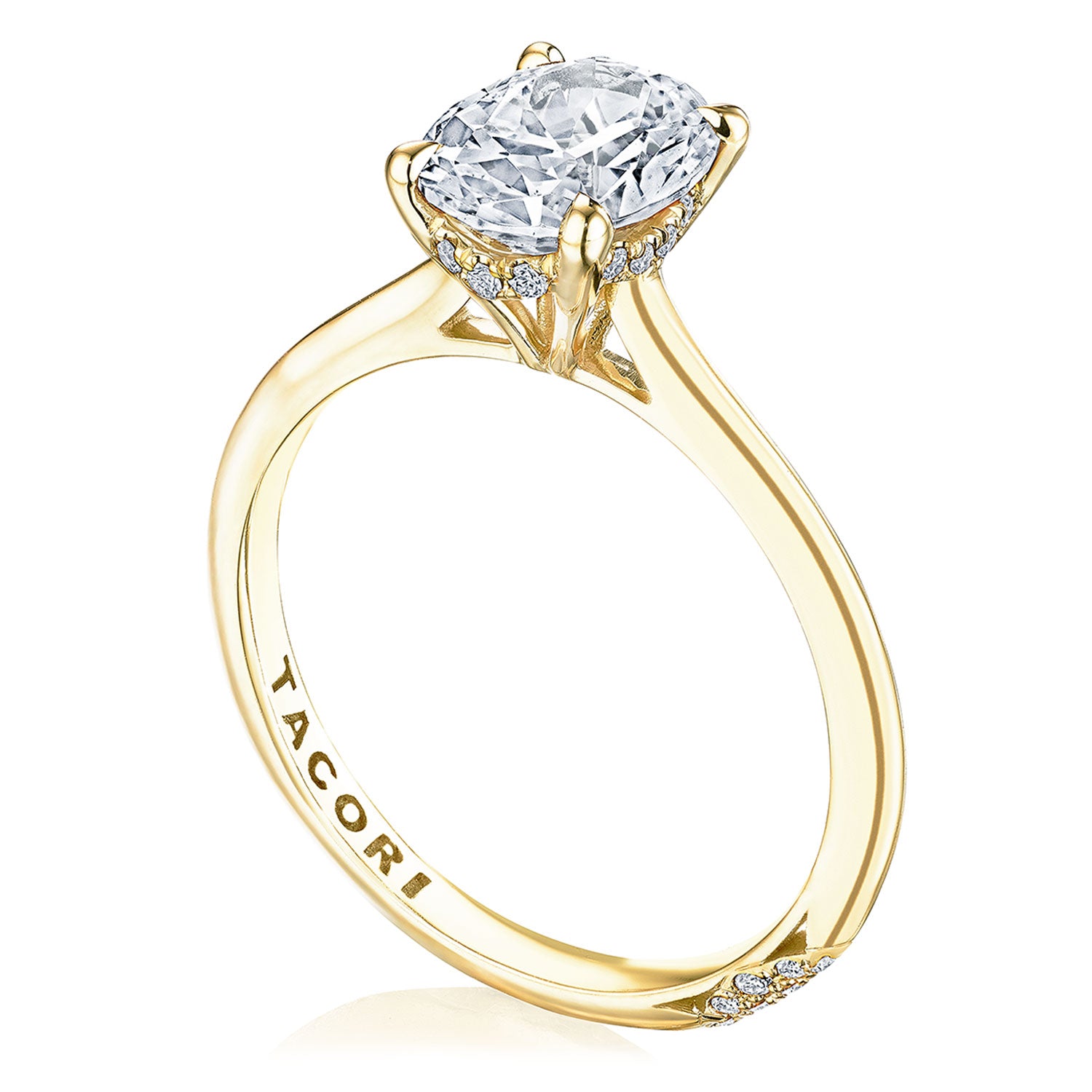 Designed by our Founder, Haig Tacorian, this stunning four-prong, solitaire engagement ring features a oval-cut center stone on a high-polished band. Discover the hidden bloom of diamonds underneath the crown and the diamond-studded crescent signature at the foundation.