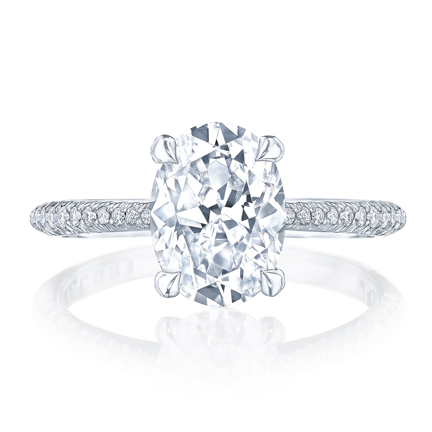 Designed by our Founder, Haig Tacorian, this stunning four-prong, solitaire engagement ring features a oval-cut center stone on a French-pavé set diamond band. Discover the hidden bloom of diamonds underneath the crown and the diamond-studded crescent signature at the foundation.