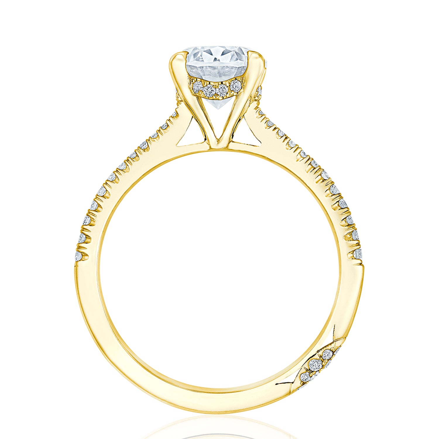 Designed by our Founder, Haig Tacorian, this stunning four-prong, solitaire engagement ring features a oval-cut center stone on a French-pavé set diamond band. Discover the hidden bloom of diamonds underneath the crown and the diamond-studded crescent signature at the foundation.
