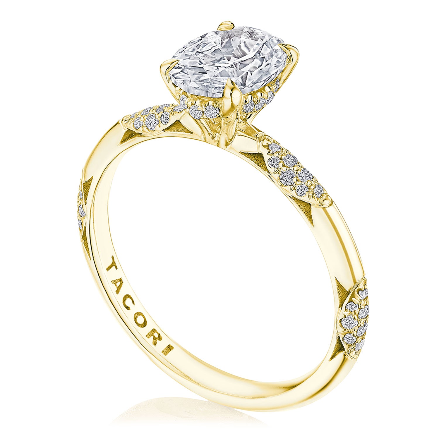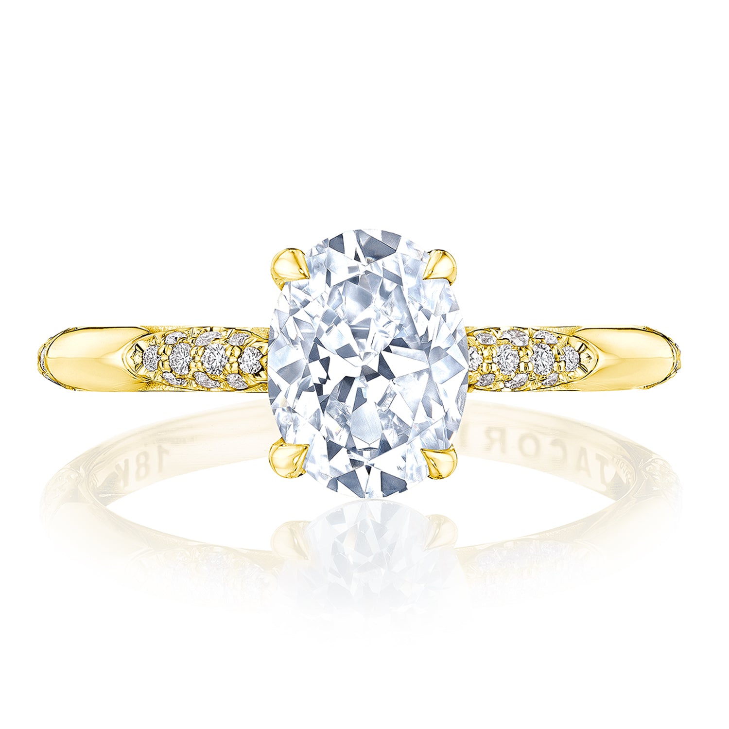 Designed by our Founder, Haig Tacorian, this Classic 360° Foundation, 4-prong engagement ring with an oval-cut center features a touch of sparkle all around the band. Discover the diamond-intense Tacori crescent signature.