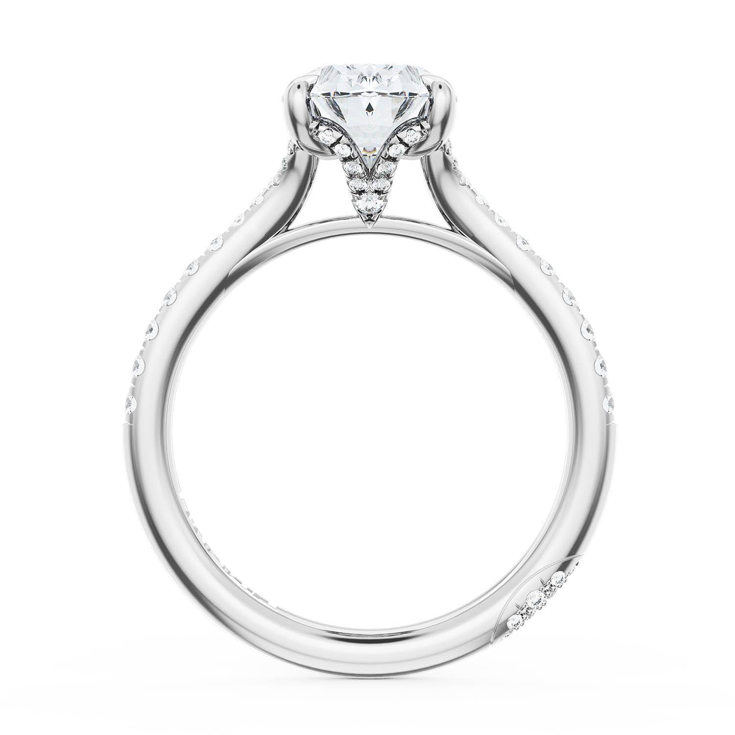 An Oval Solitaire is set into a unique corset-inspired crown on a 18kt White Gold foundation. Pavé-set diamonds decorate the ceiling and a diamond-studded Founder's Crescent marks the resting point.