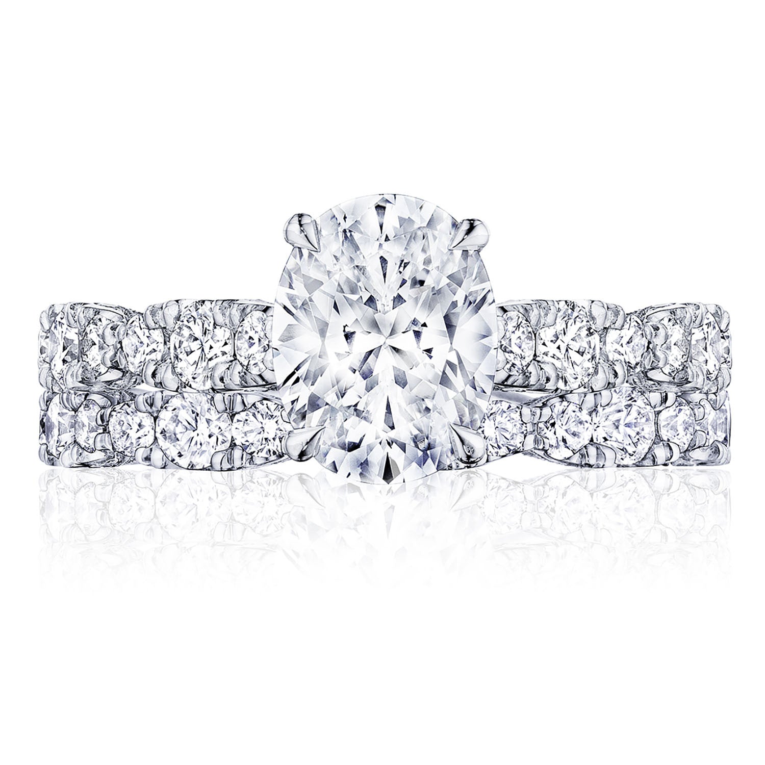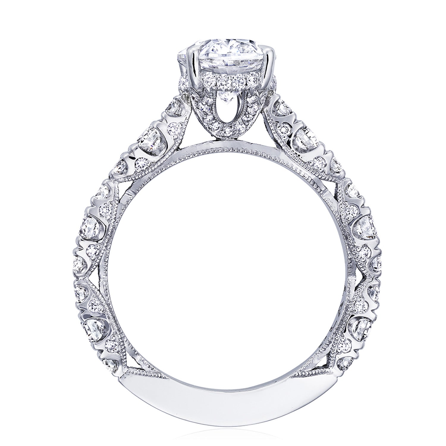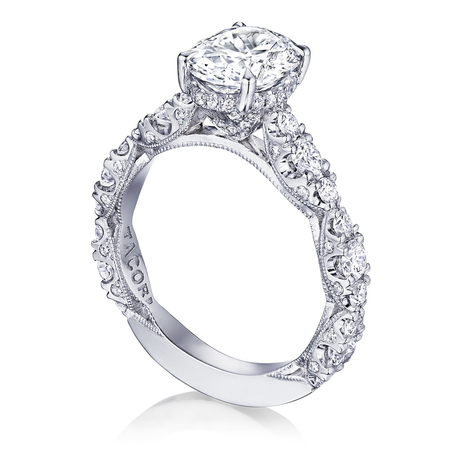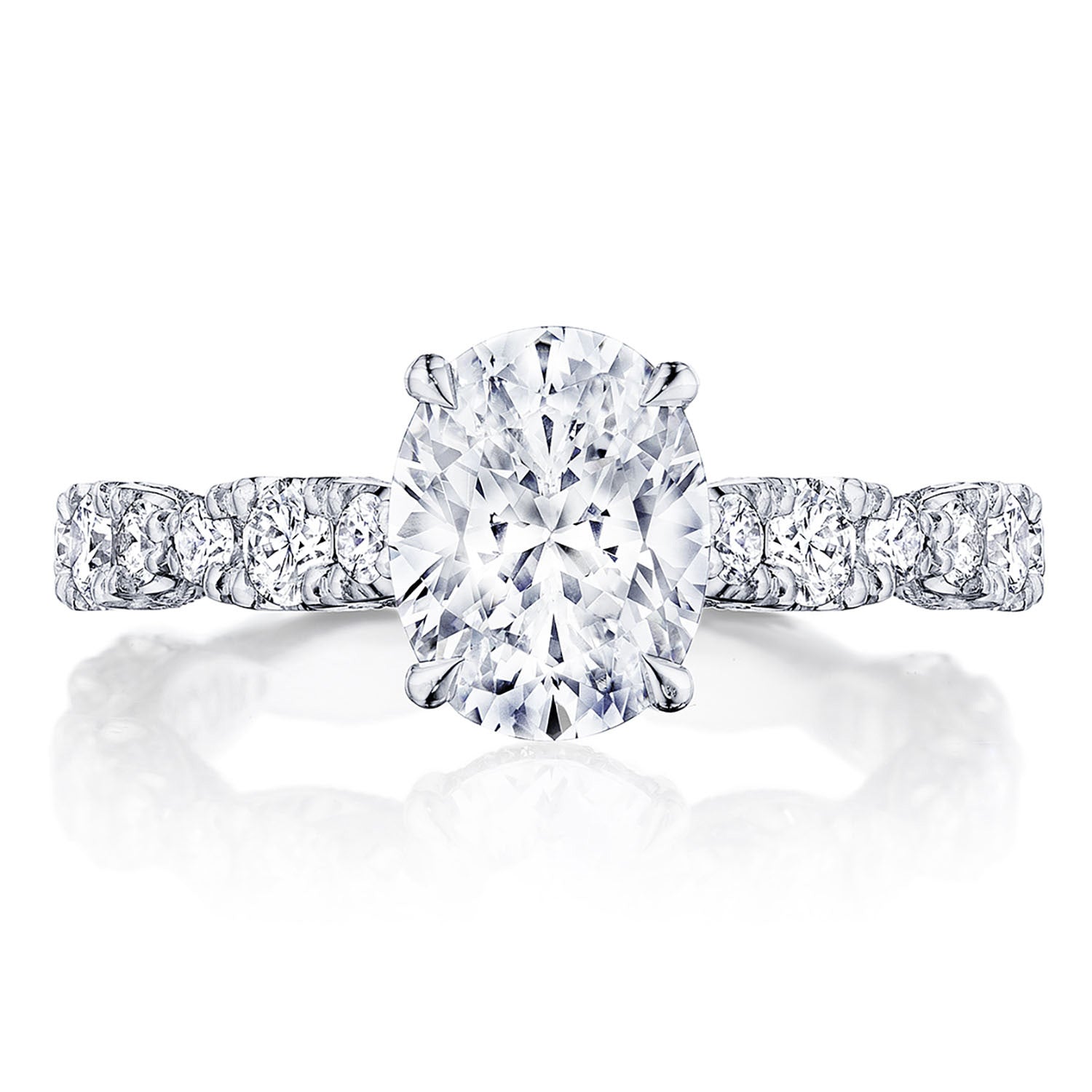Beautiful marquise shapes with brilliant graduating diamonds dance along this stunning oval cut diamond engagement ring. Discover the hidden crescent diamond underlay that acts as a pedestal of diamonds to spotlight the center diamond.
