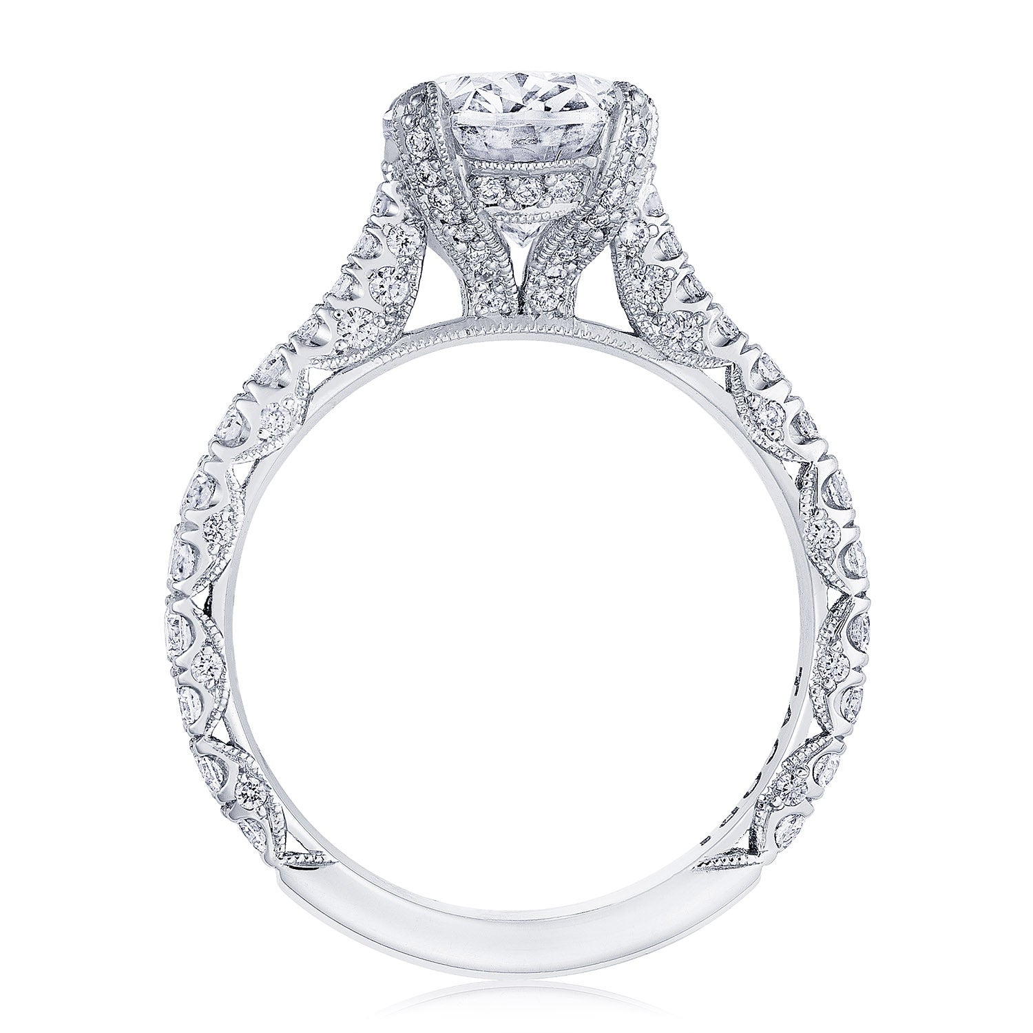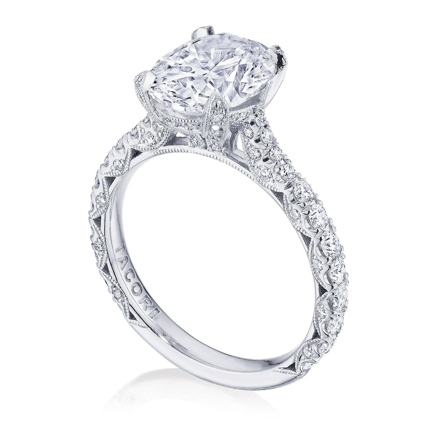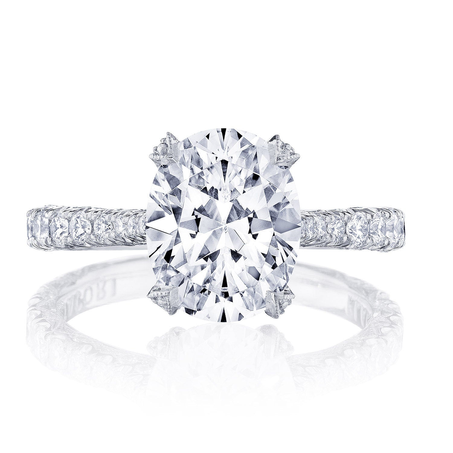 Best of both worlds, we've combined a "less metal, more diamond" intense look with the the classic refinement of our RoyalT Collection to fit your 2 carat and up oval center diamond.