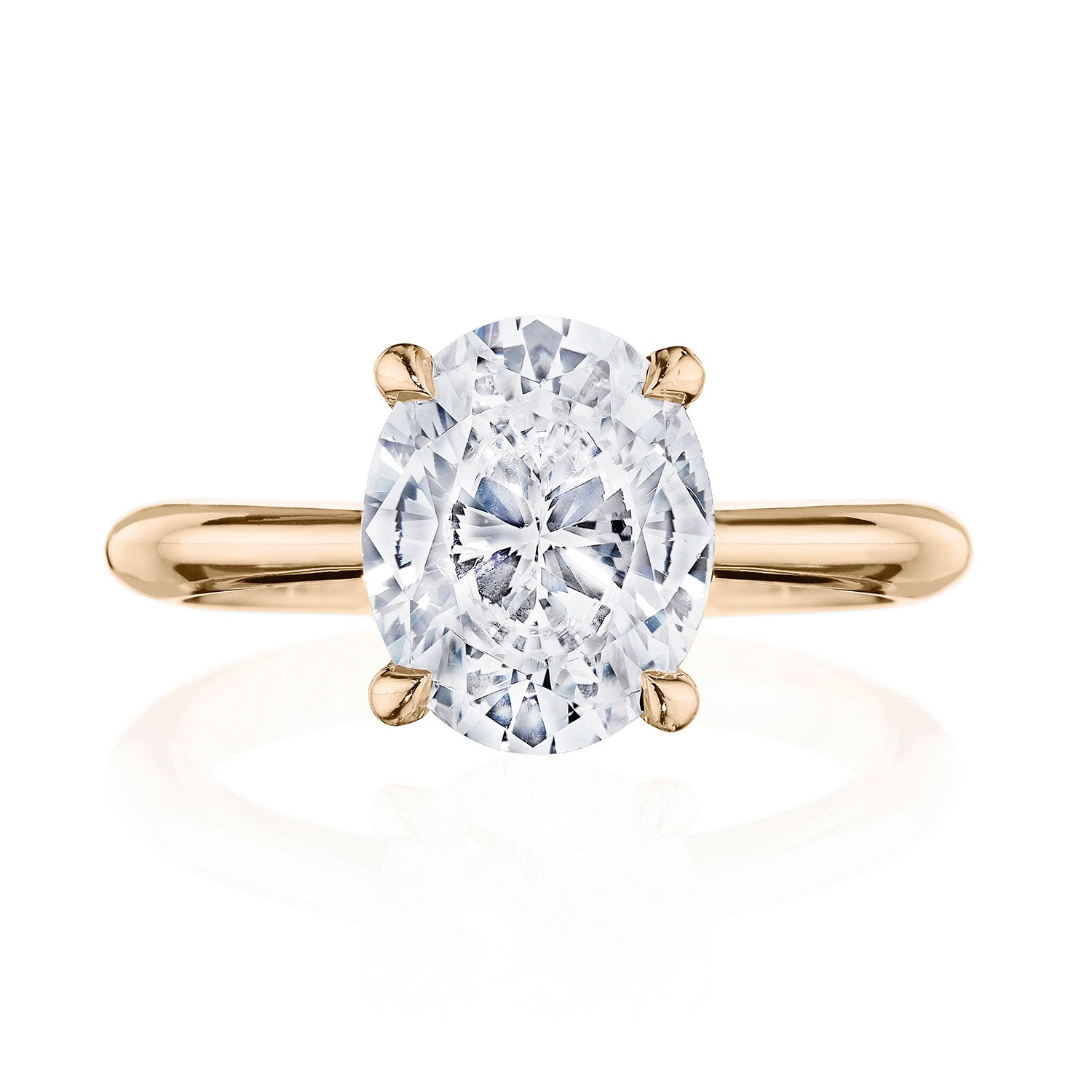 Designed by our Founder, Haig Tacorian, this stunning four-prong, solitaire engagement ring features a oval-cut center stone on a high-polished band. Discover the hidden bloom of diamonds underneath the crown and the diamond-studded crescent signature at the foundation.
