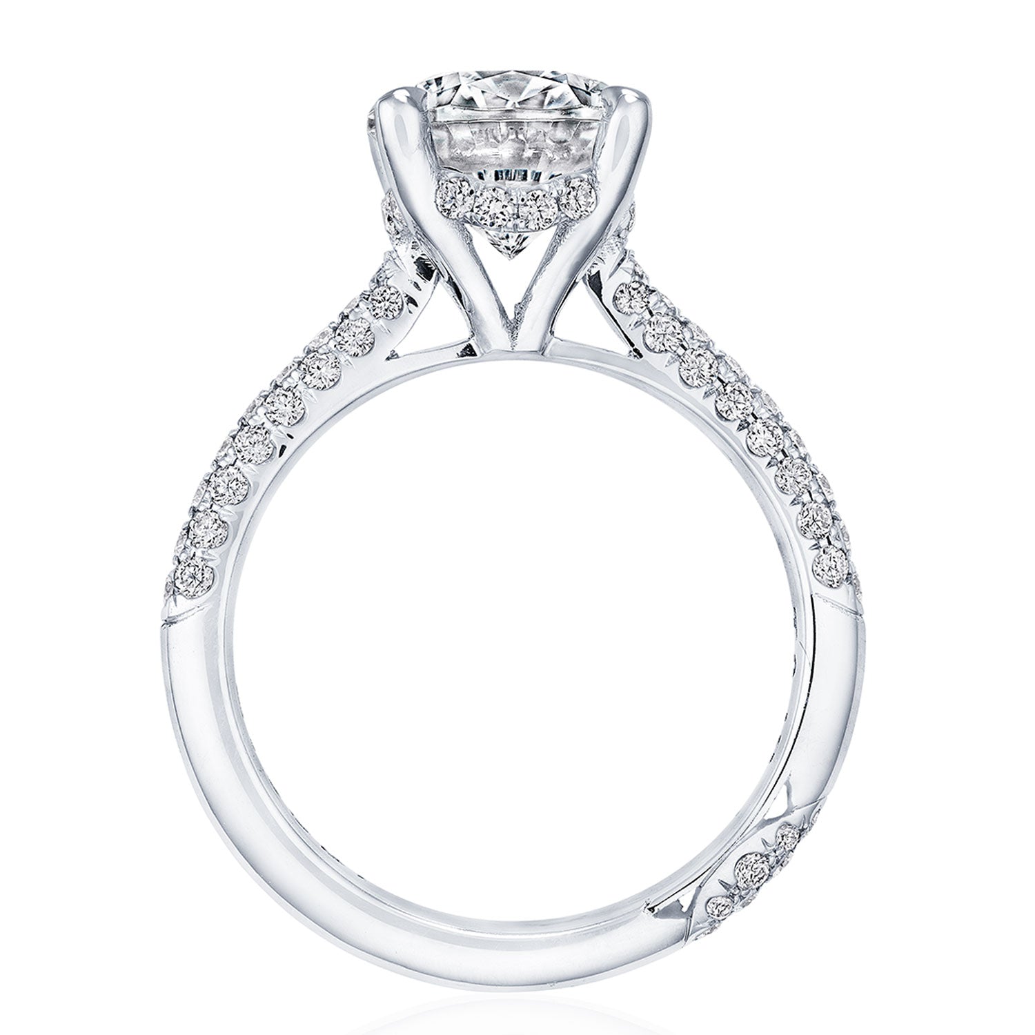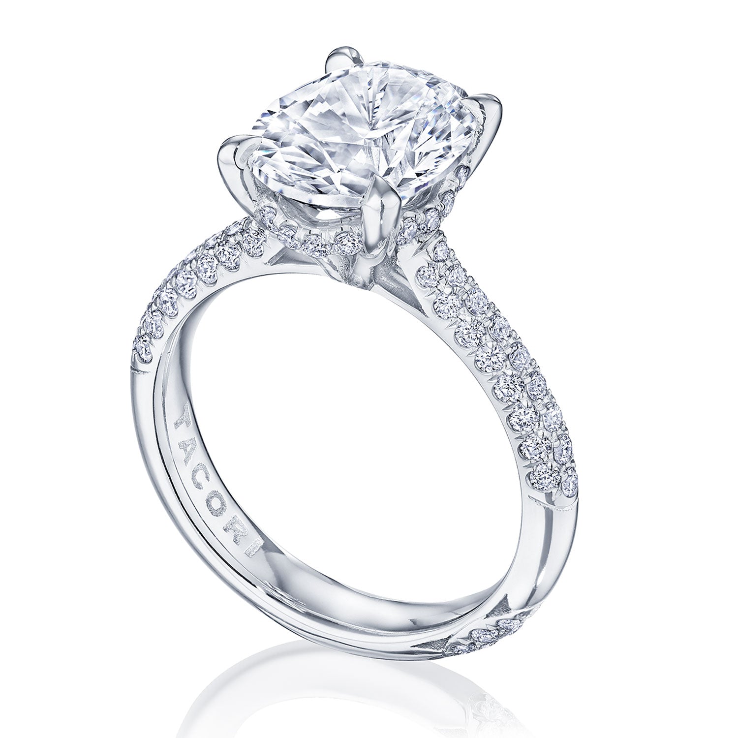 Designed by our Founder, Haig Tacorian, this stunning four-prong, solitaire engagement ring features a oval-cut center stone on a three-row pavé-set, diamond-intense band. Discover the hidden bloom of diamonds underneath the crown and the diamond-studded crescent signature at the foundation.