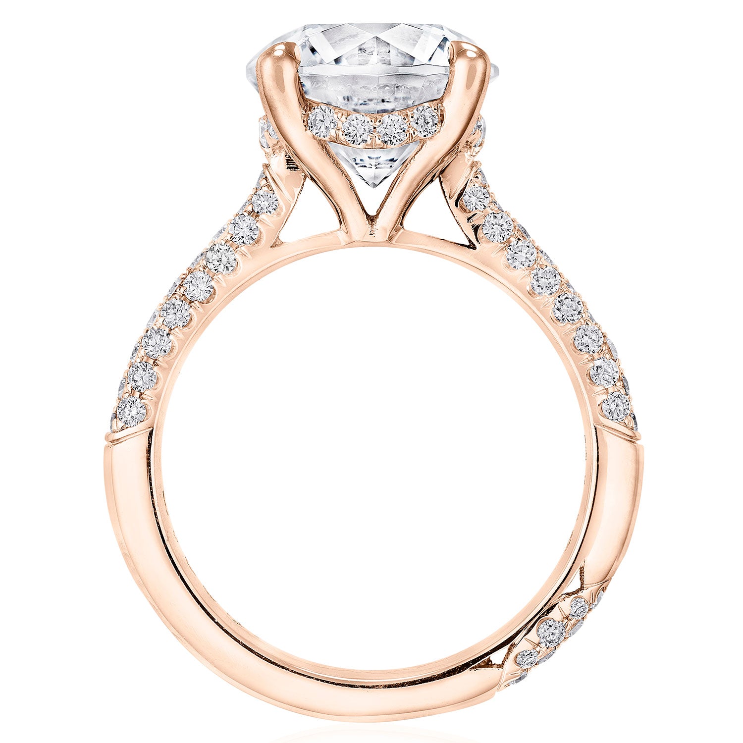 Designed by our Founder, Haig Tacorian, this stunning four-prong, solitaire engagement ring features a oval-cut center stone on a three-row pavé-set, diamond-intense band. Discover the hidden bloom of diamonds underneath the crown and the diamond-studded crescent signature at the foundation.