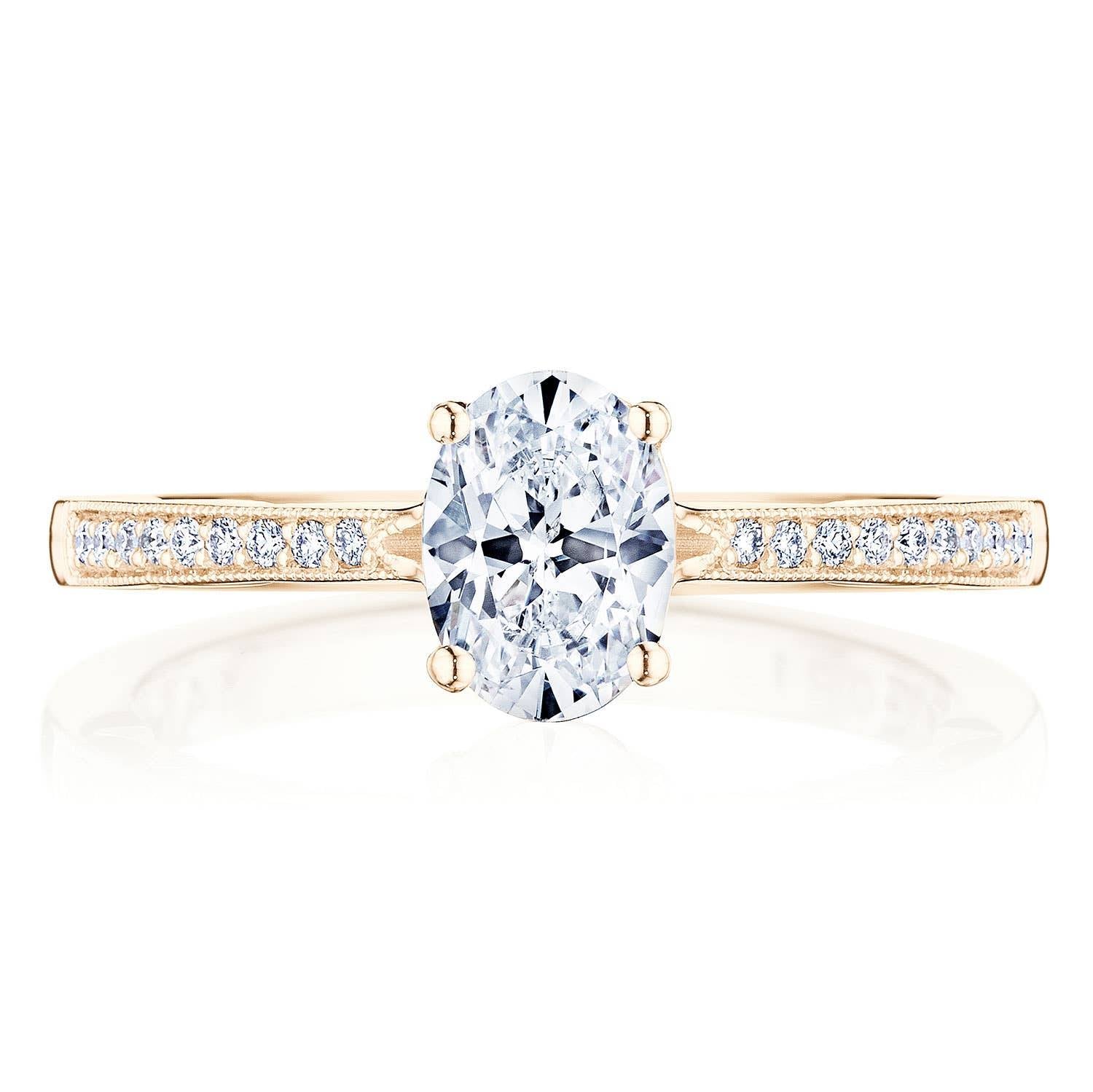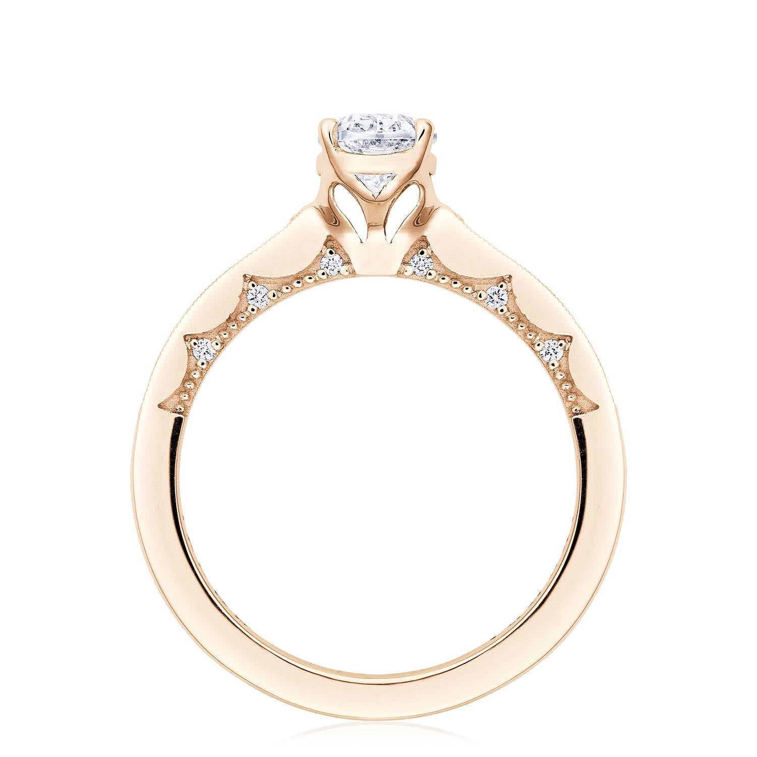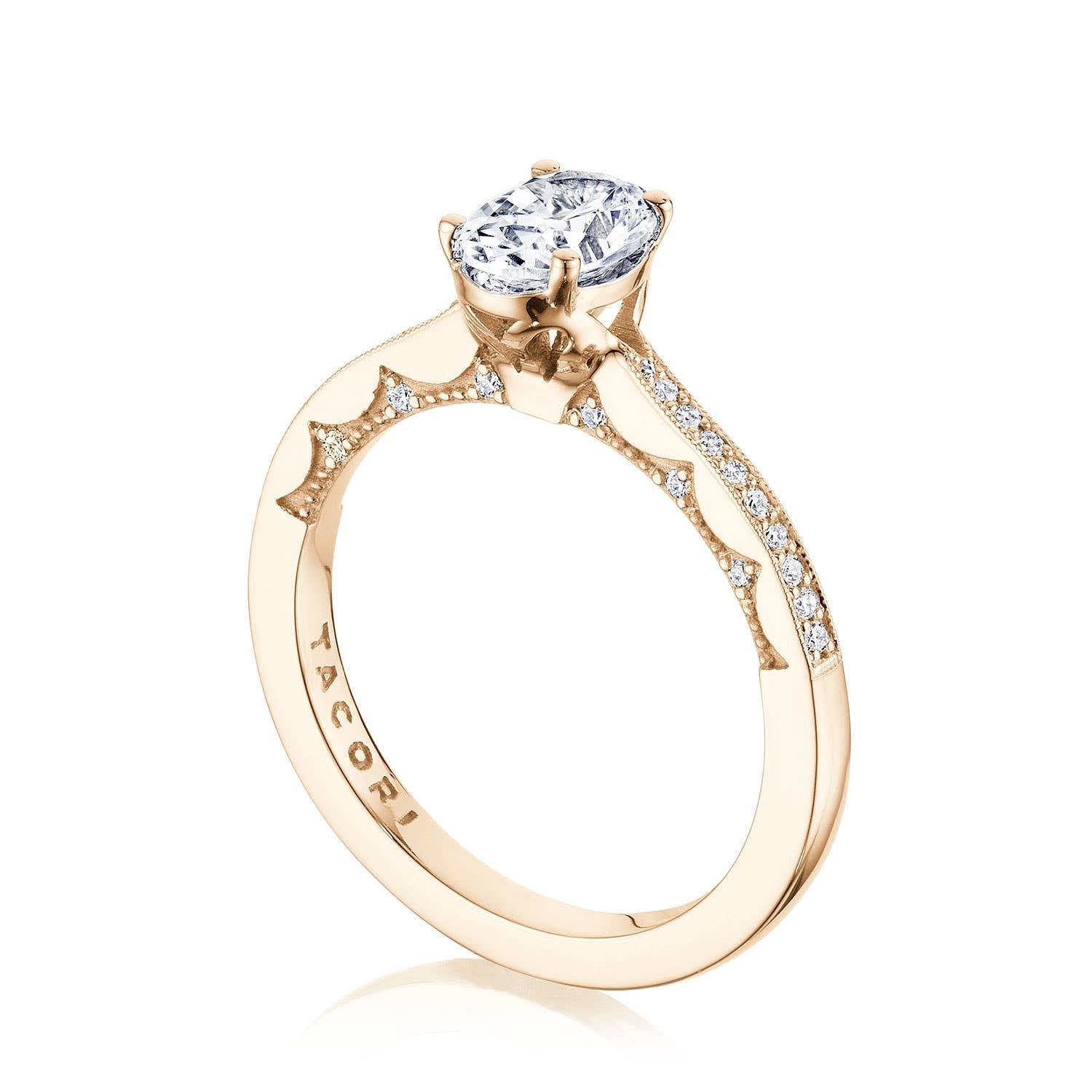 Dainty and sweet, an oval cut diamond solitaire rests gently on a diamond band, with the Coastal Crescent inner face with pinpoint diamond details for a truly regal look.