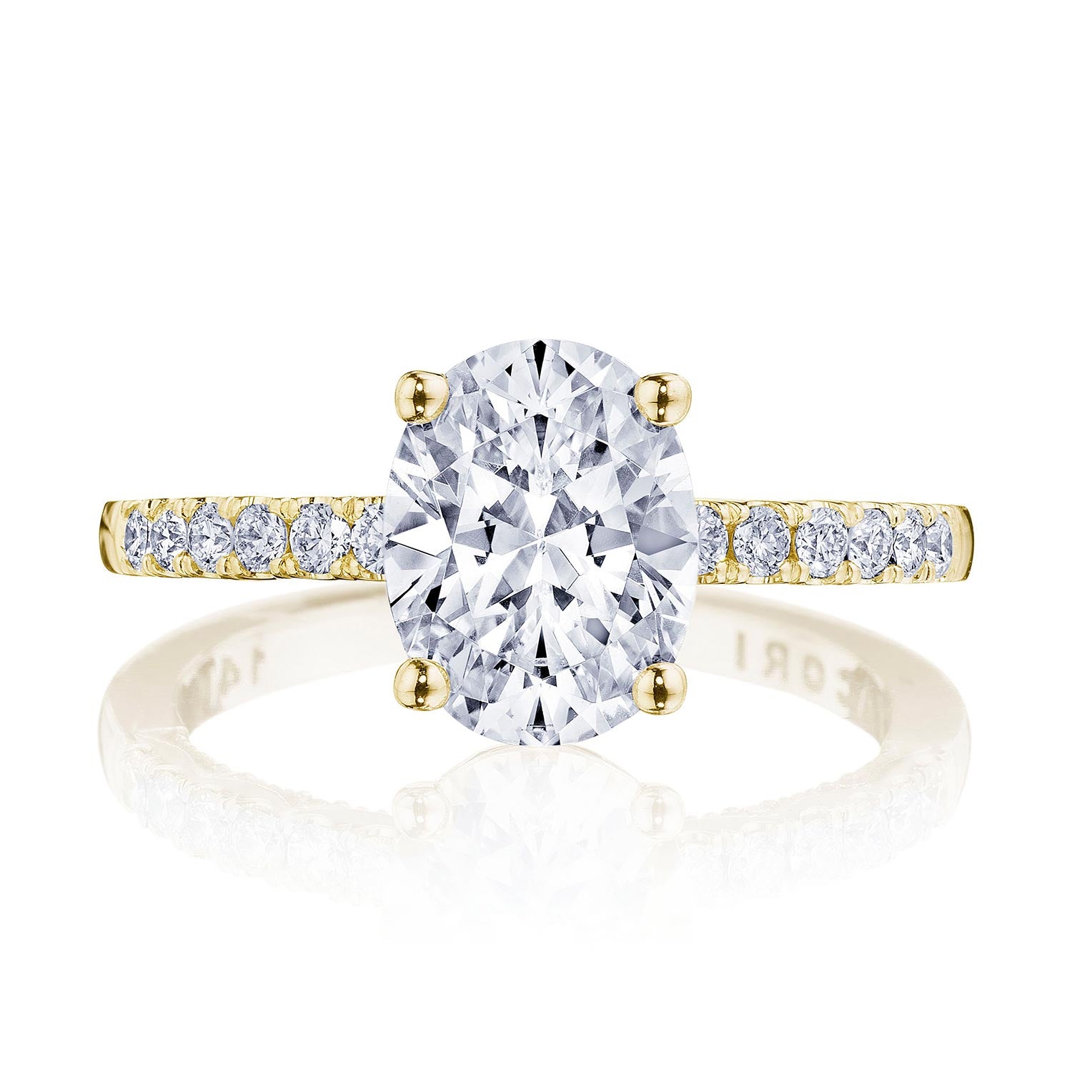 Less metal, means more scene-stealing diamond action. An oval cut diamond solitaire rests gently on a diamond band with french pavé, revealing more diamond than metal. This ring features the Coastal Crescent inner face with pinpoint diamond details for a truly regal look.