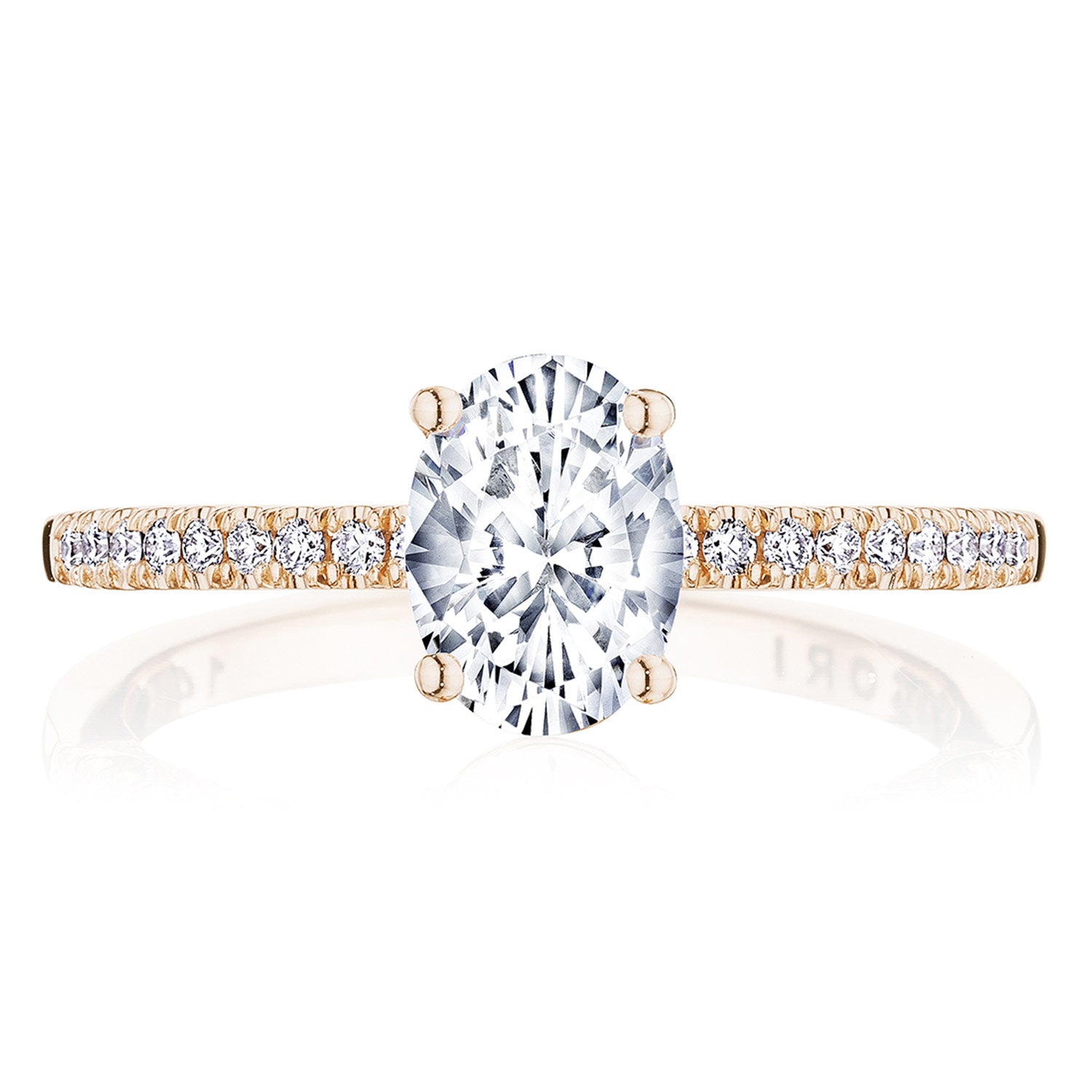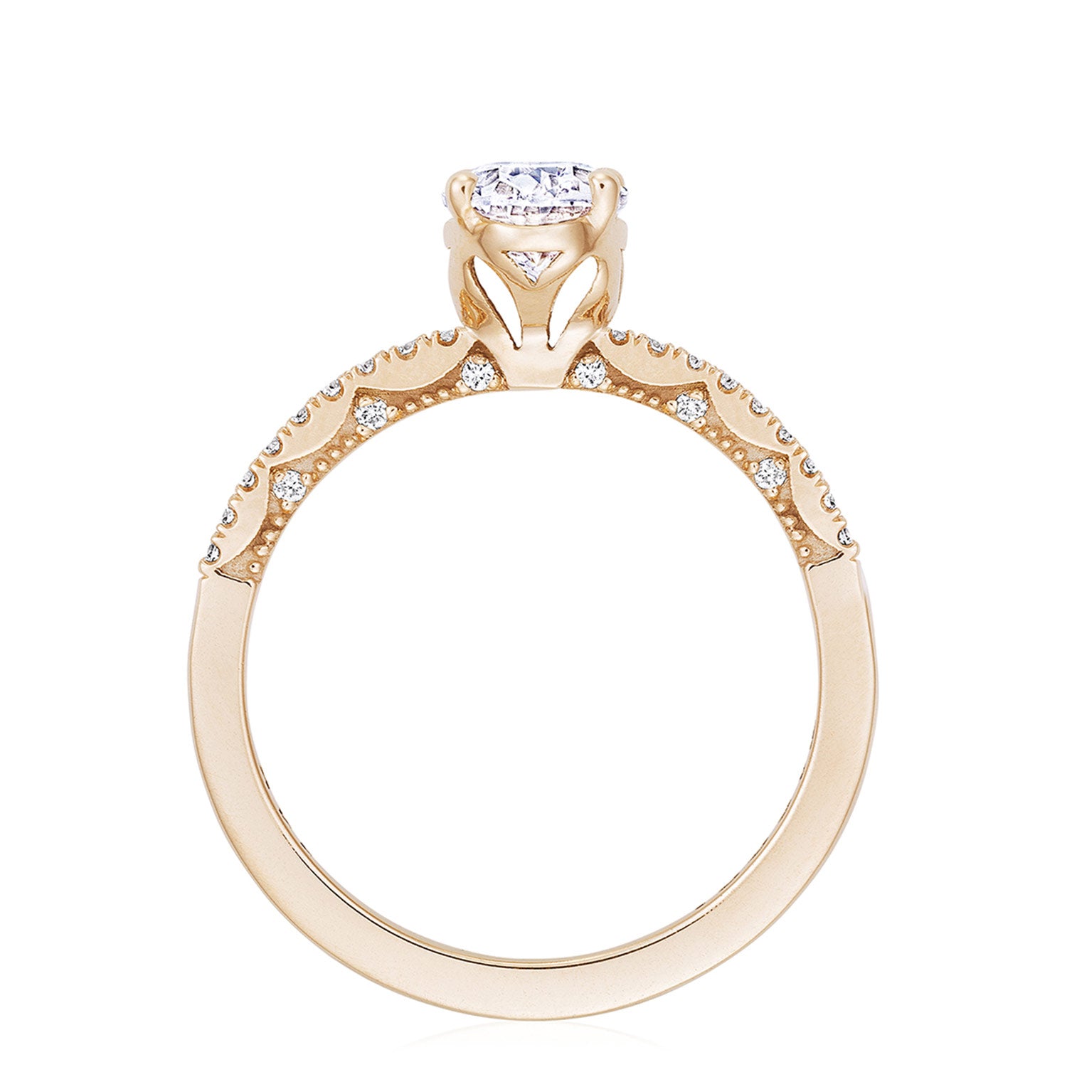 Less metal, means more scene-stealing diamond action. An oval cut diamond solitaire rests gently on a diamond band with french pavé, revealing more diamond than metal. This ring features the Coastal Crescent inner face with pinpoint diamond details for a truly regal look.