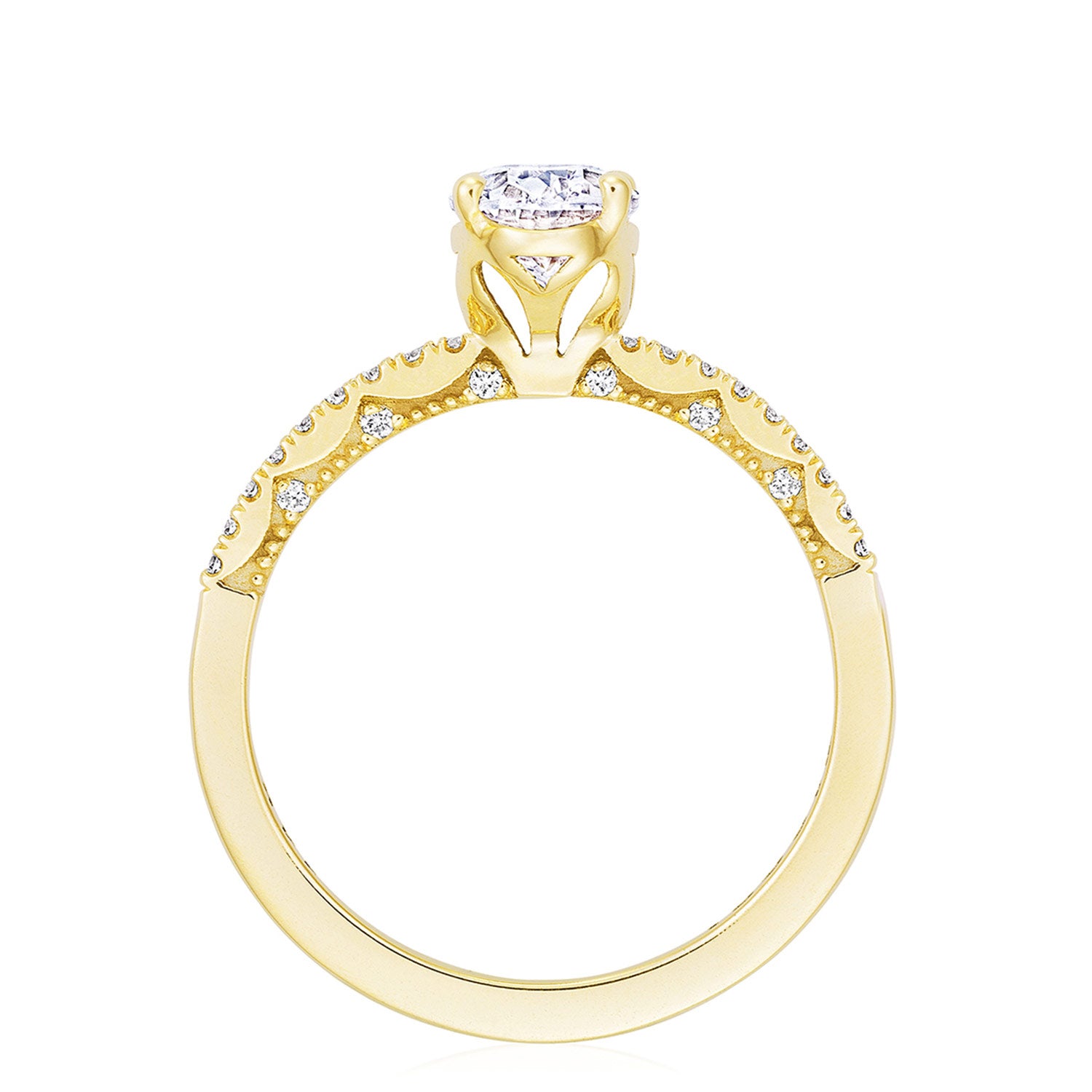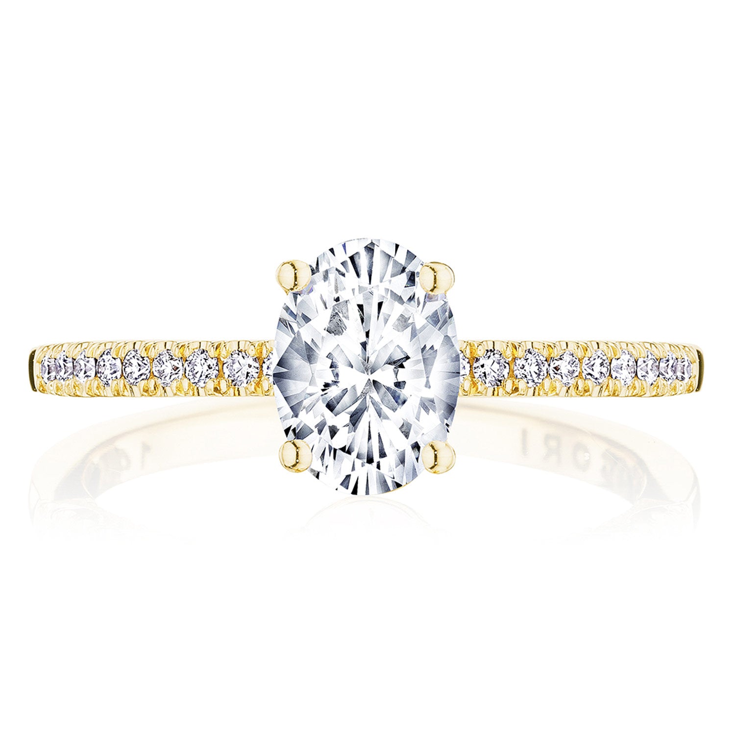 Less metal, means more scene-stealing diamond action. An oval cut diamond solitaire rests gently on a diamond band with french pavé, revealing more diamond than metal. This ring features the Coastal Crescent inner face with pinpoint diamond details for a truly regal look.