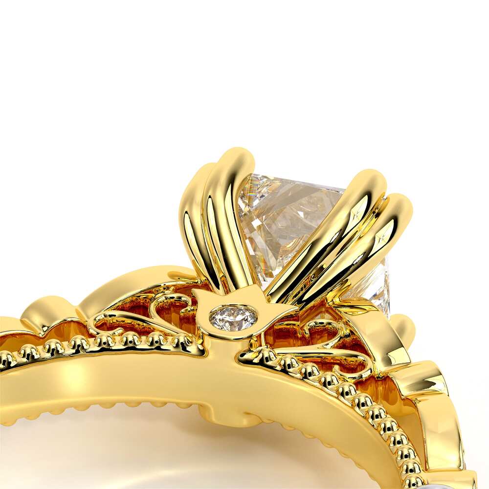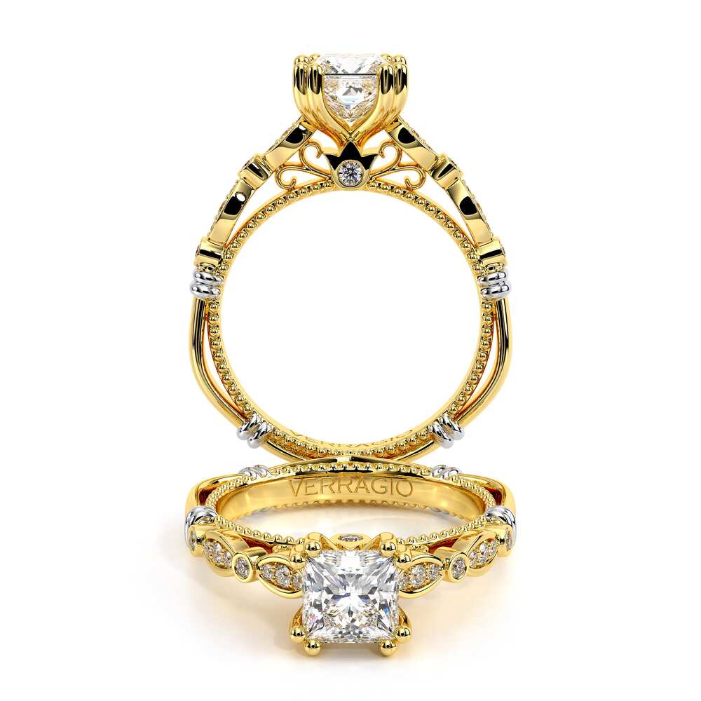PARISIAN-100P is a vintage inspired engagement ring that focuses on the unique bezel set round brilliant-cut diamonds, handcrafted Parisian lace and our rose gold Timeless wraps all to enhance the princess cut center.