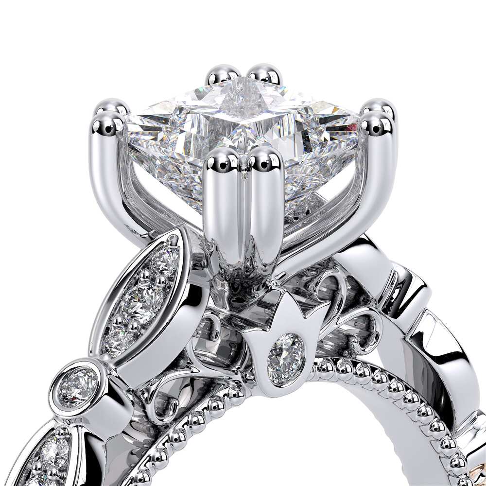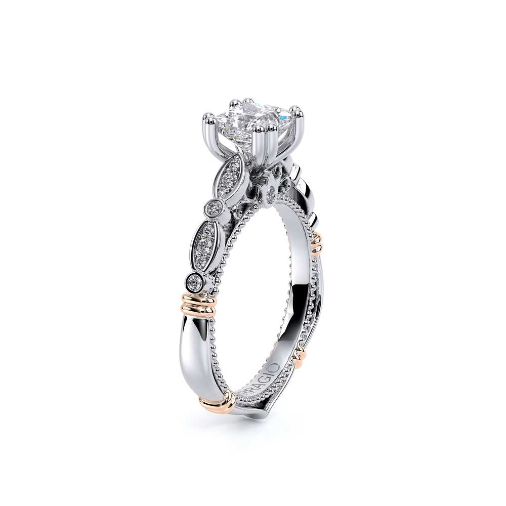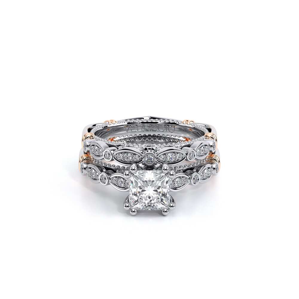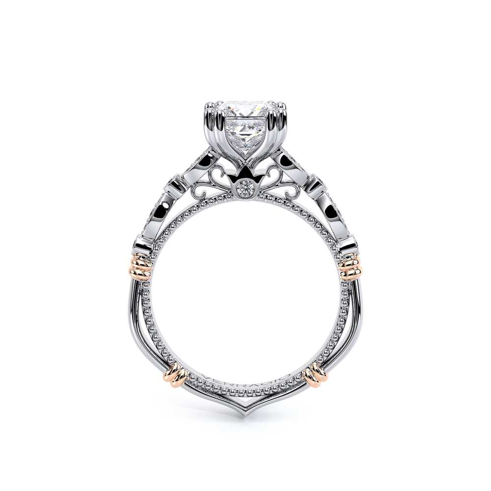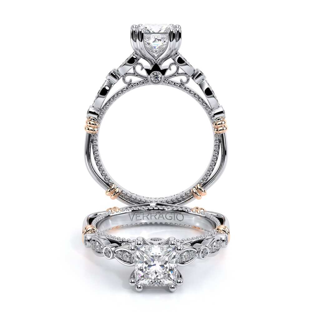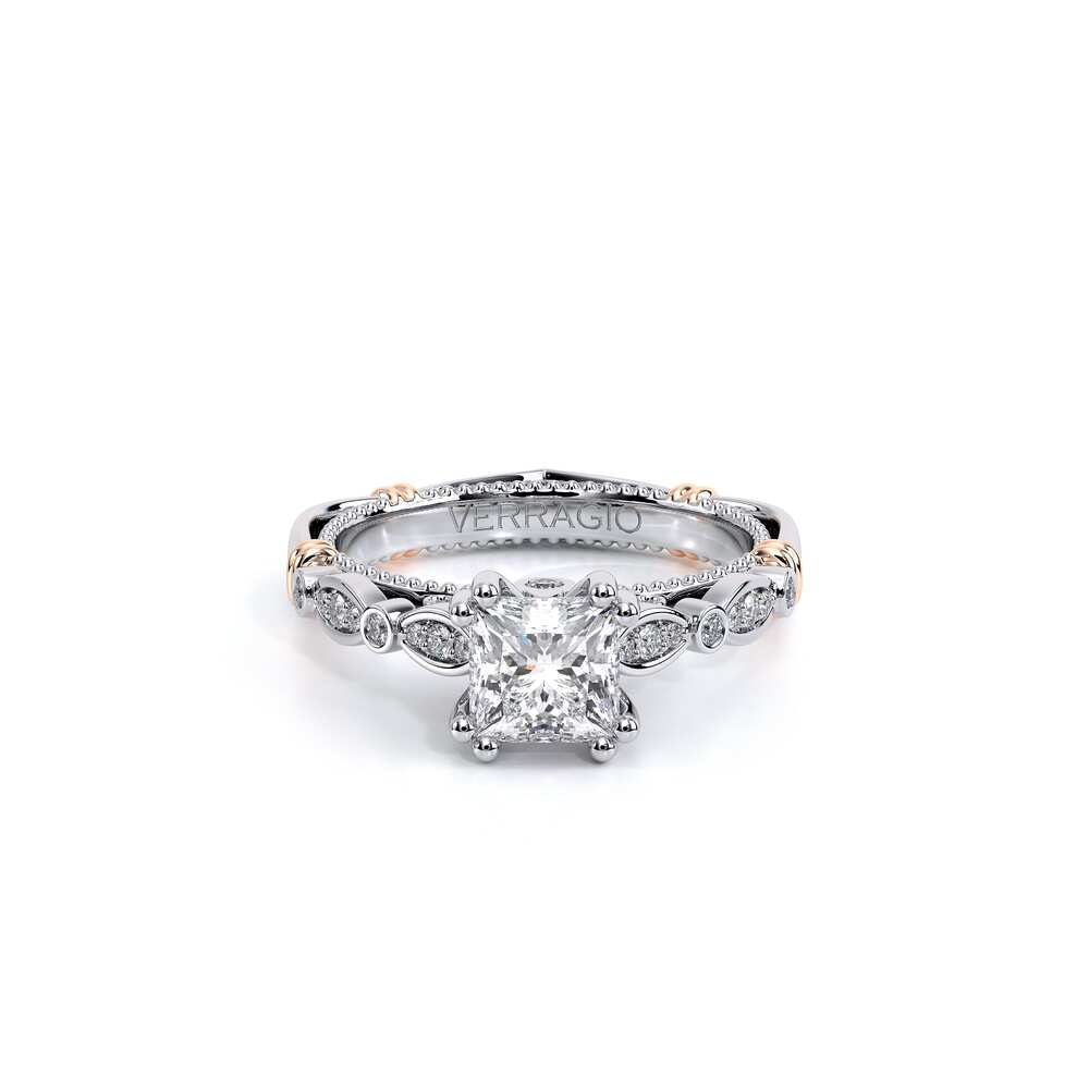 PARISIAN-100P is a vintage inspired engagement ring that focuses on the unique bezel set round brilliant-cut diamonds, handcrafted Parisian lace and our rose gold Timeless wraps all to enhance the princess cut center.