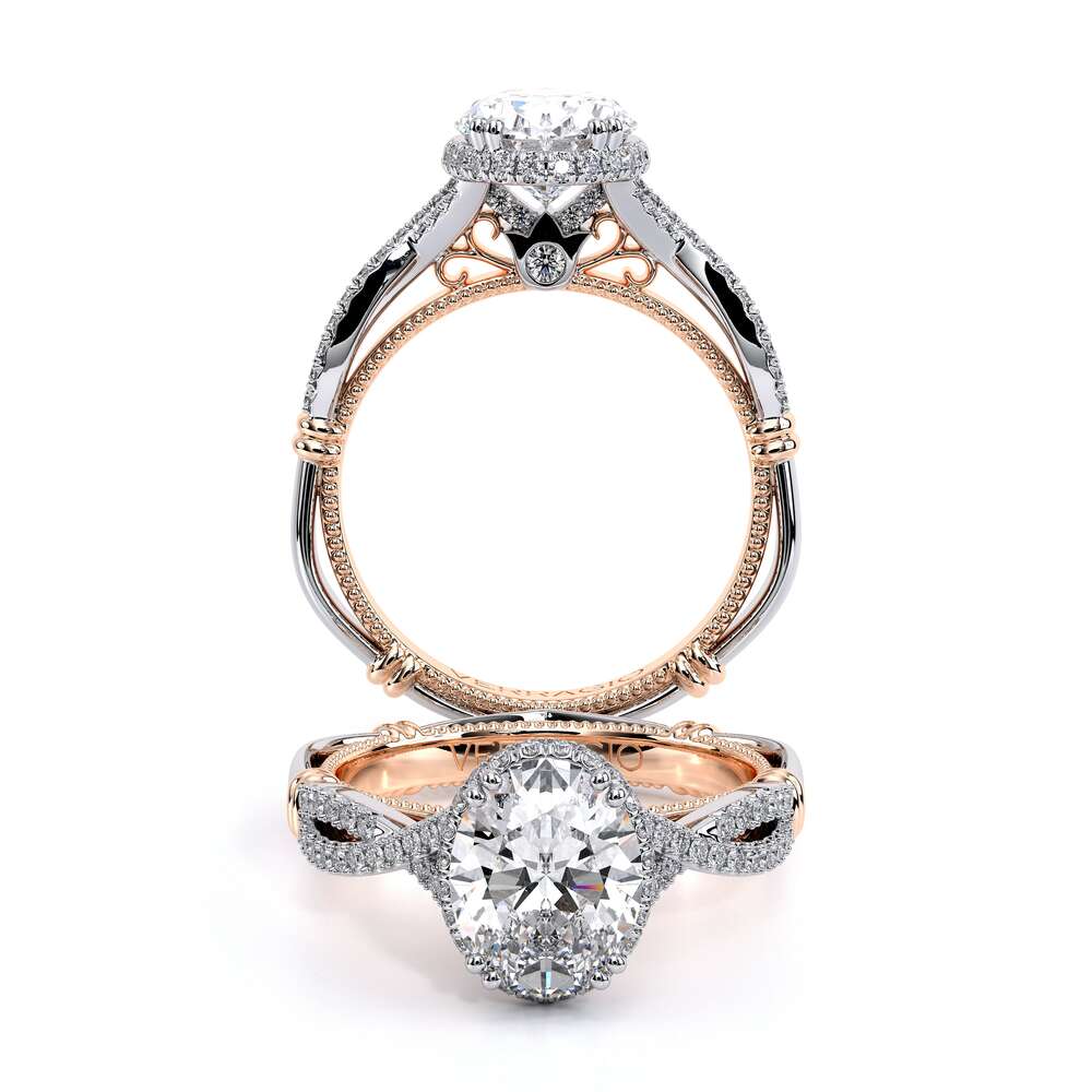 Parisian-105-XOV is a classic engagement ring that features pave set twisted diamond band showcasing our brand new Stardust Oval halo. The details continue to flow with the addition of Parisian Lace, our Verragio signature beading and lastly the rose gold Timeless wraps.