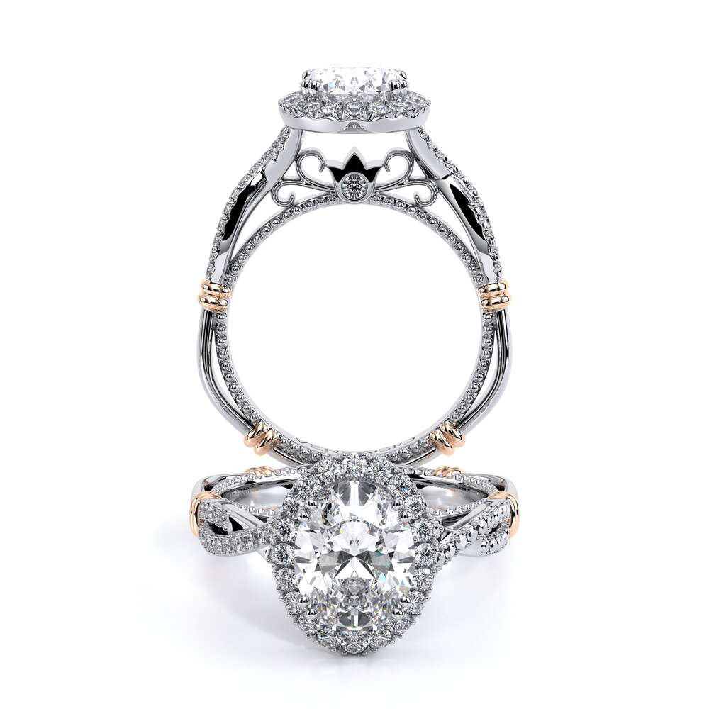 Parisian-106OV is a classic engagement ring that features pave set twisted diamond band with a brilliant oval halo, Parisian Lace detail, our Verragio signature beading and lastly adorned with rose gold Timeless wraps.