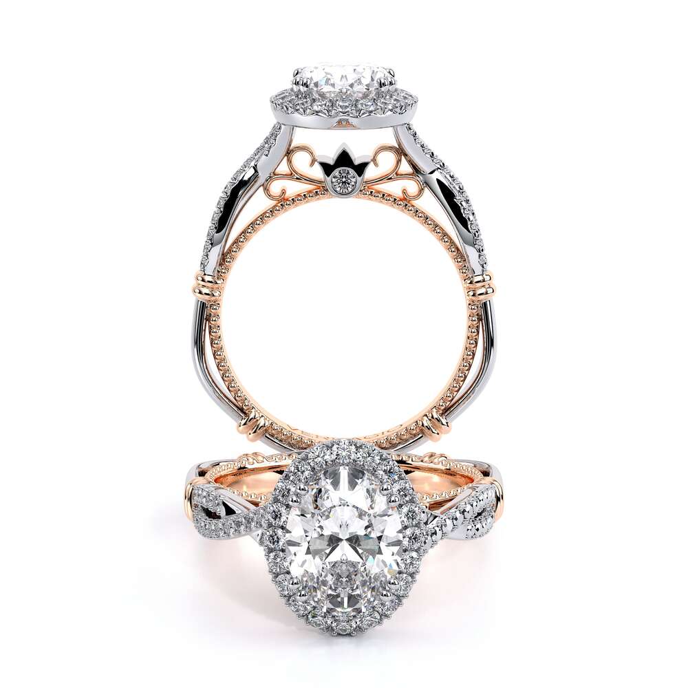 Parisian-106OV is a classic engagement ring that features pave set twisted diamond band with a brilliant oval halo, Parisian Lace detail, our Verragio signature beading and lastly adorned with rose gold Timeless wraps.