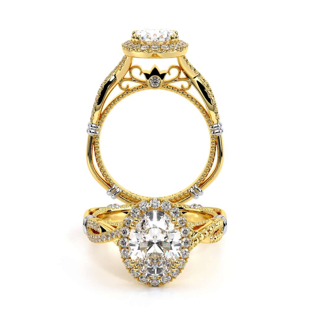Parisian-106OV is a classic engagement ring that features pave set twisted diamond band with a brilliant oval halo, Parisian Lace detail, our Verragio signature beading and lastly adorned with rose gold Timeless wraps.