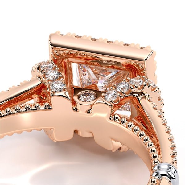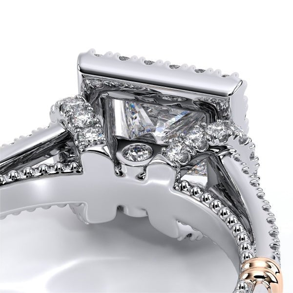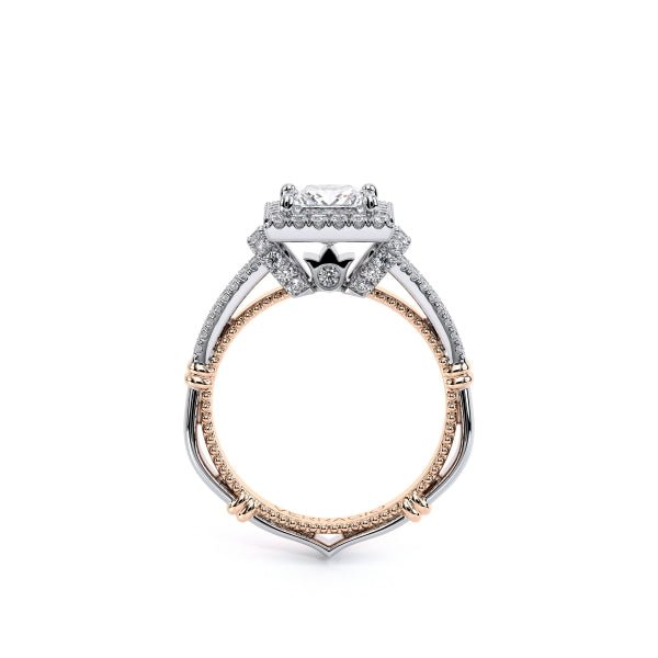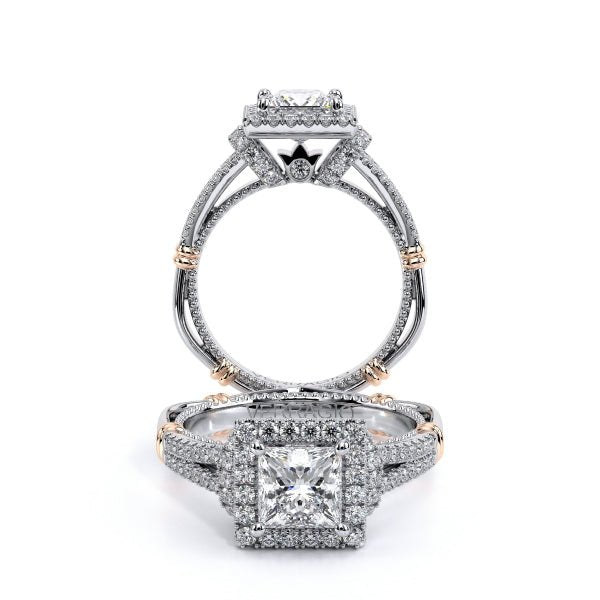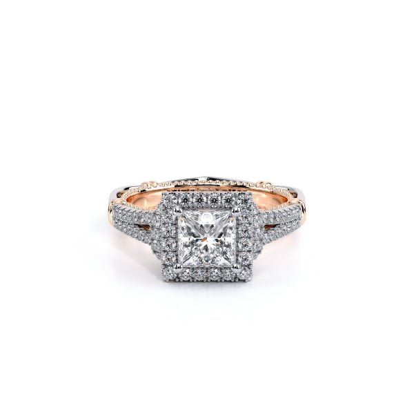 Elevate your love story with the exquisite Verragio Women's Engagement Ring from the Parisian collection. Featuring a vintage design with diamond encrusted pillars and a princess halo, this timeless piece is perfect for a center stone of up to 2.00ct Princess.