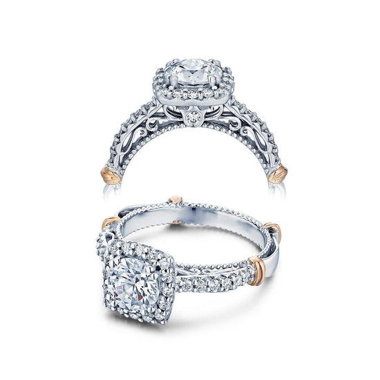 Elevate your engagement with the exquisite Verragio Women's Engagement Ring from the Parisian Collection. Style Number PARISIAN-123CU features a stunning Round cut center diamond surrounded by a Cushion shaped diamond halo, rose gold wraps, and delicate inner detail.