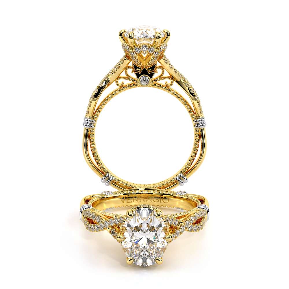 Parisian-153OV is a uniquely designed engagement ring that showcases Verragio' s diamond encrusted tiara that enhances a princess diamond center. The details continue through with the addition of the Timeless wraps, Parisian lace and Verragio signature beading.