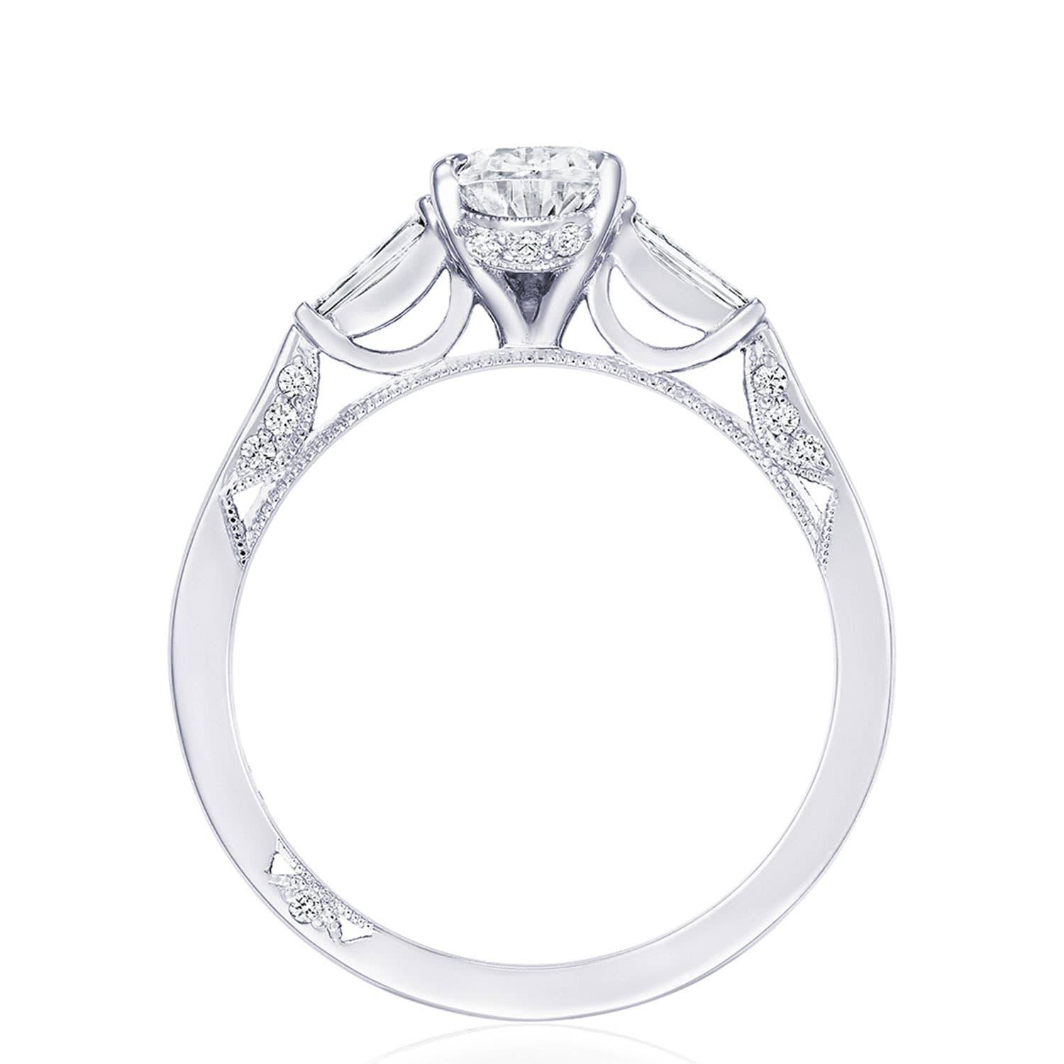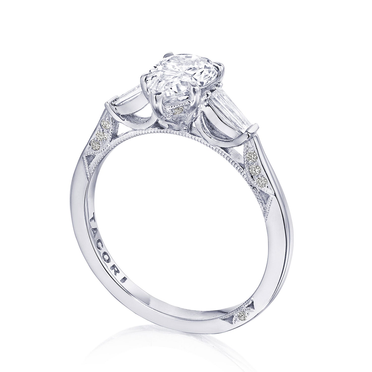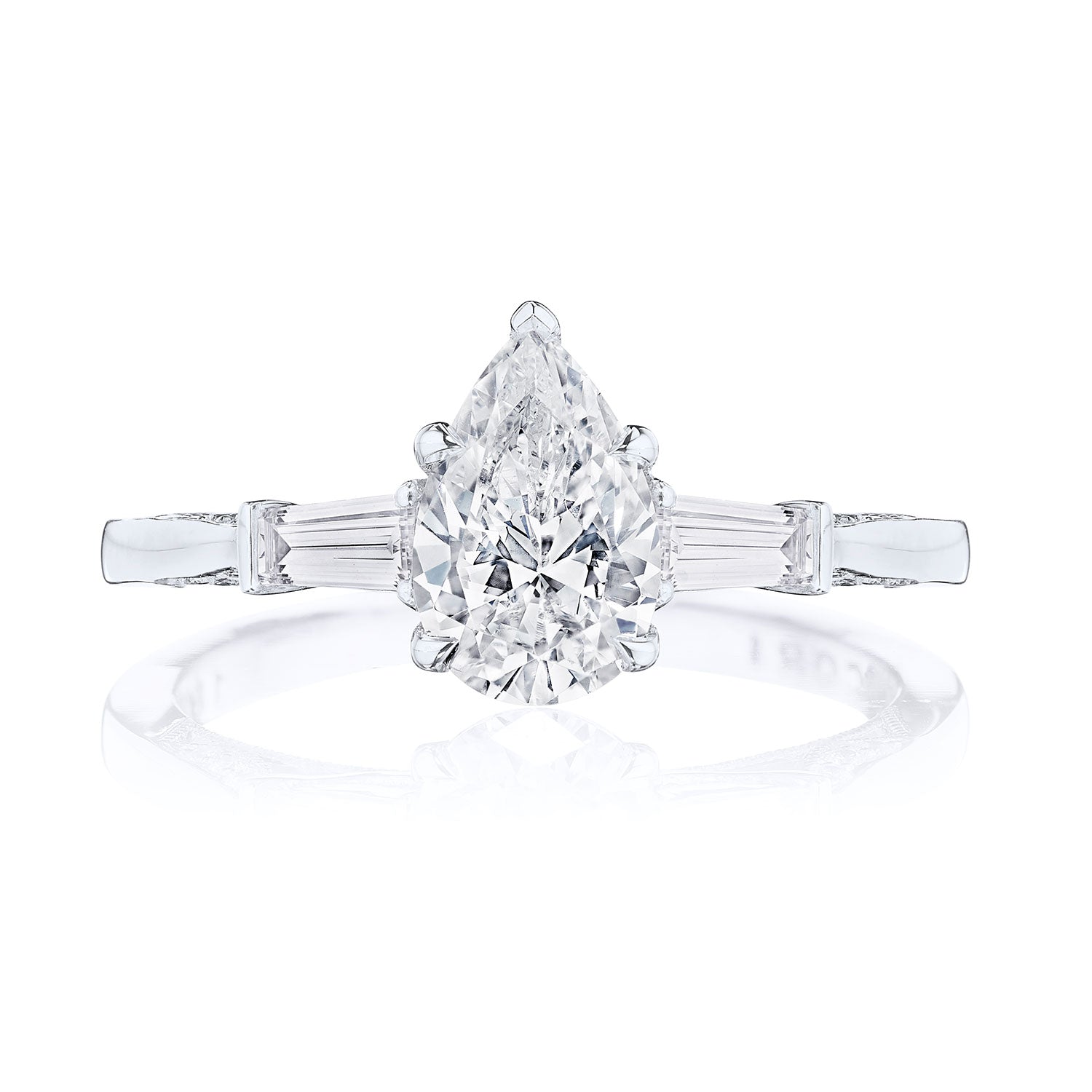 Let your diamond engagement ring stand out by contrasting your side stones with your center diamond! Baguette side stones graduate to the pear shaped center, bringing a magical contrast to bring about beauty from every angle.
