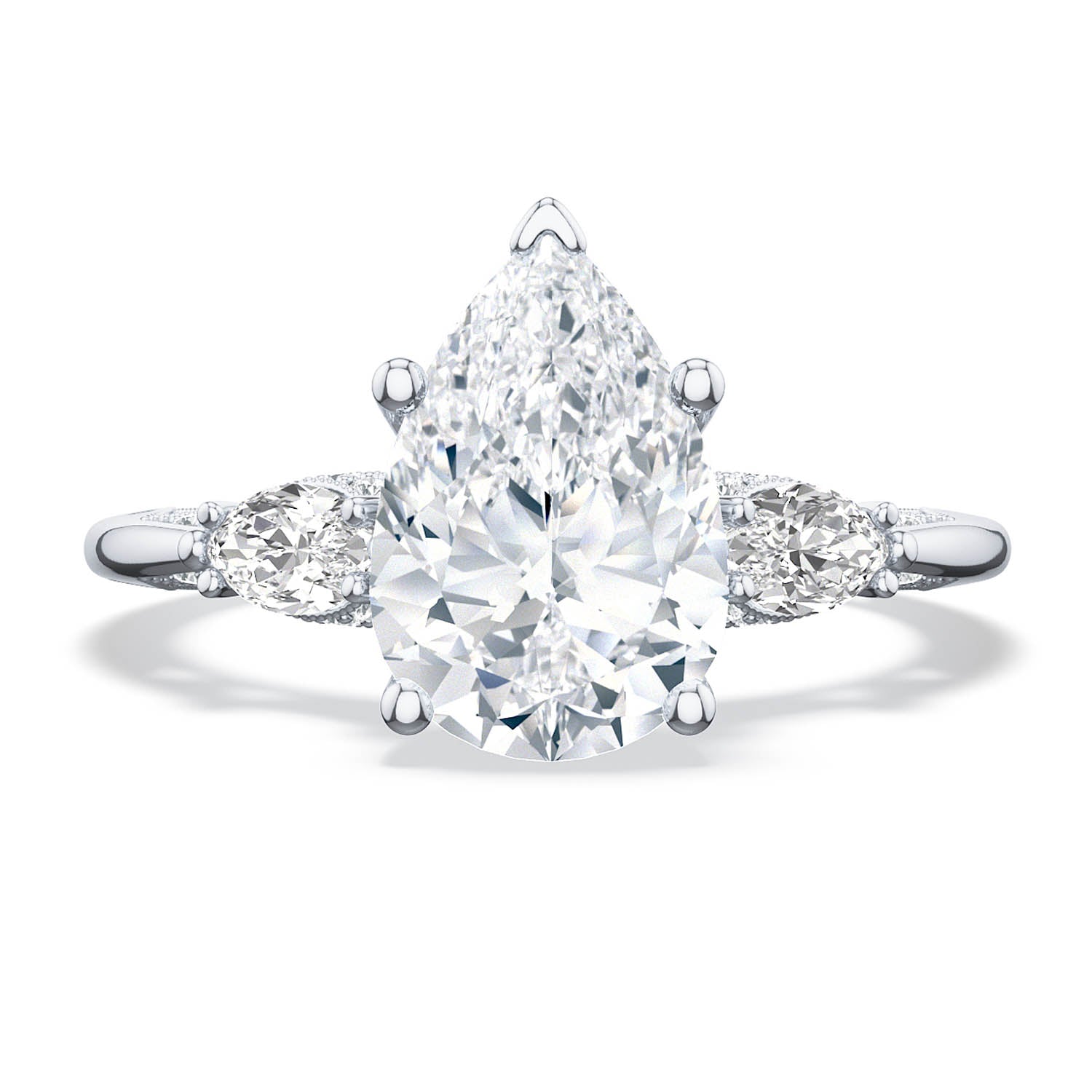 A modern twist to a classic three-stone style by featuring marquise diamonds. A Catherdral foundation with raised Tacori crescents on the shoulders and milgrain beading outlining each area, this ring elegantly shines from every angle.