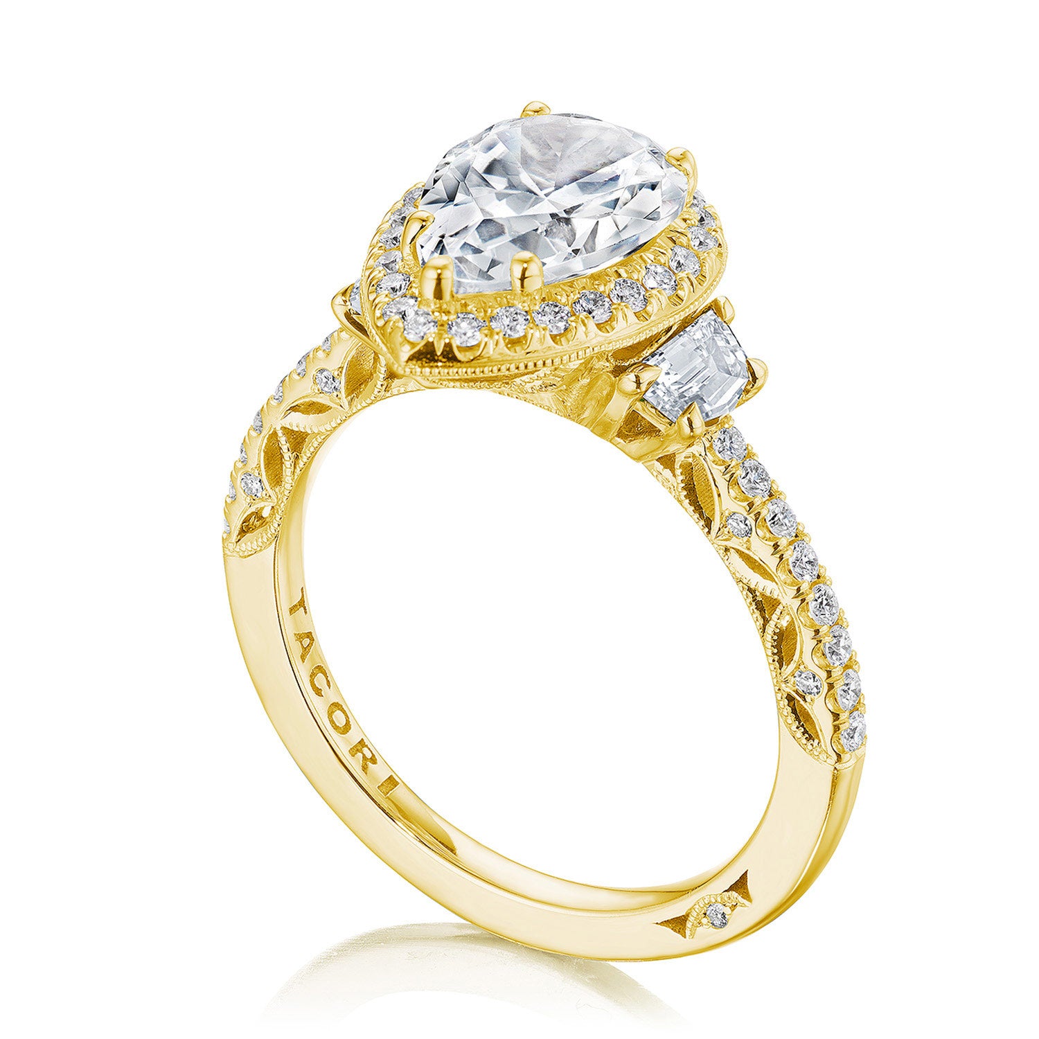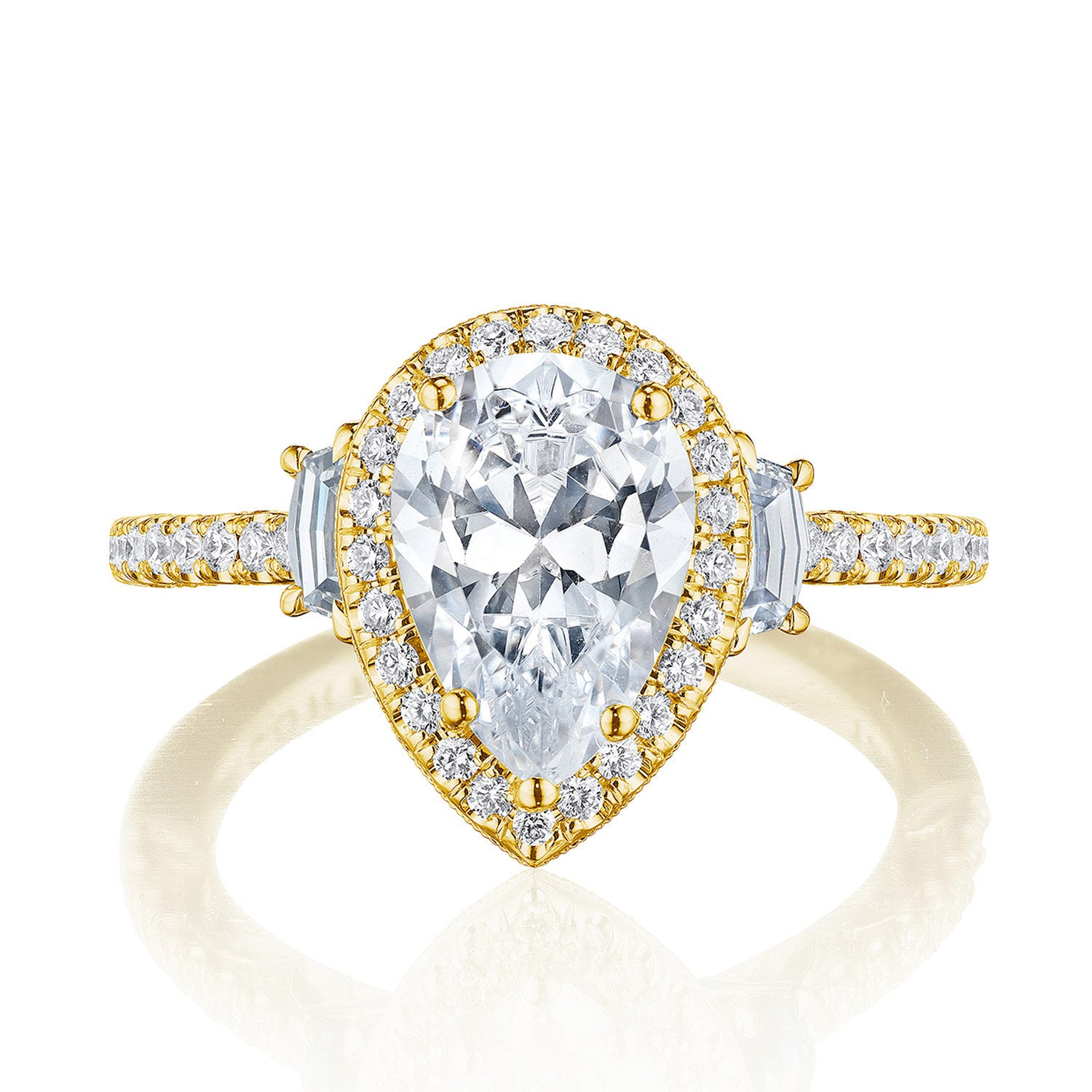 This elegant three-stone setting is exceptionally detailed. A Spotlight Bloom with radiant Cadillac side stones sit atop a meticulous French pavé band with lace-like, milgrain-edged Dantela Crescent Fabric.