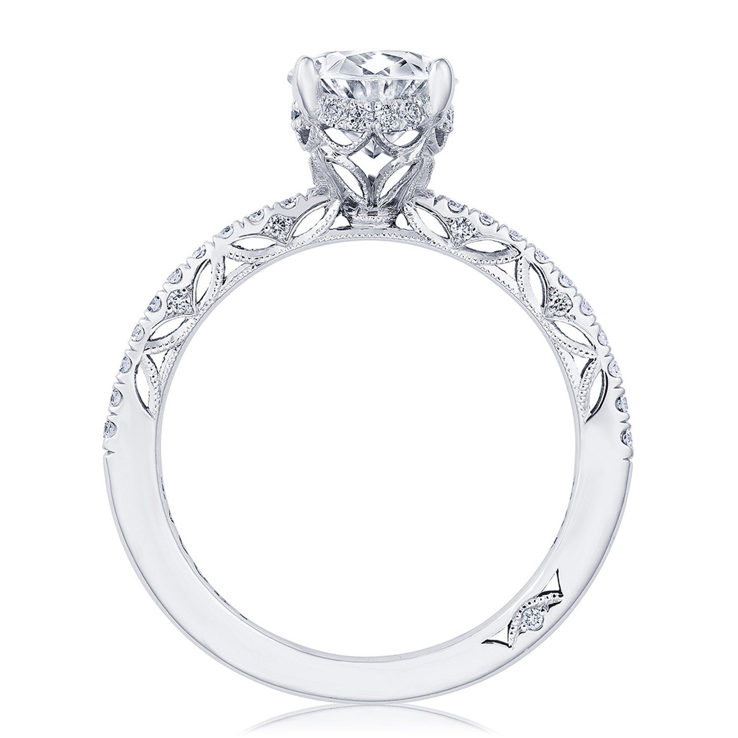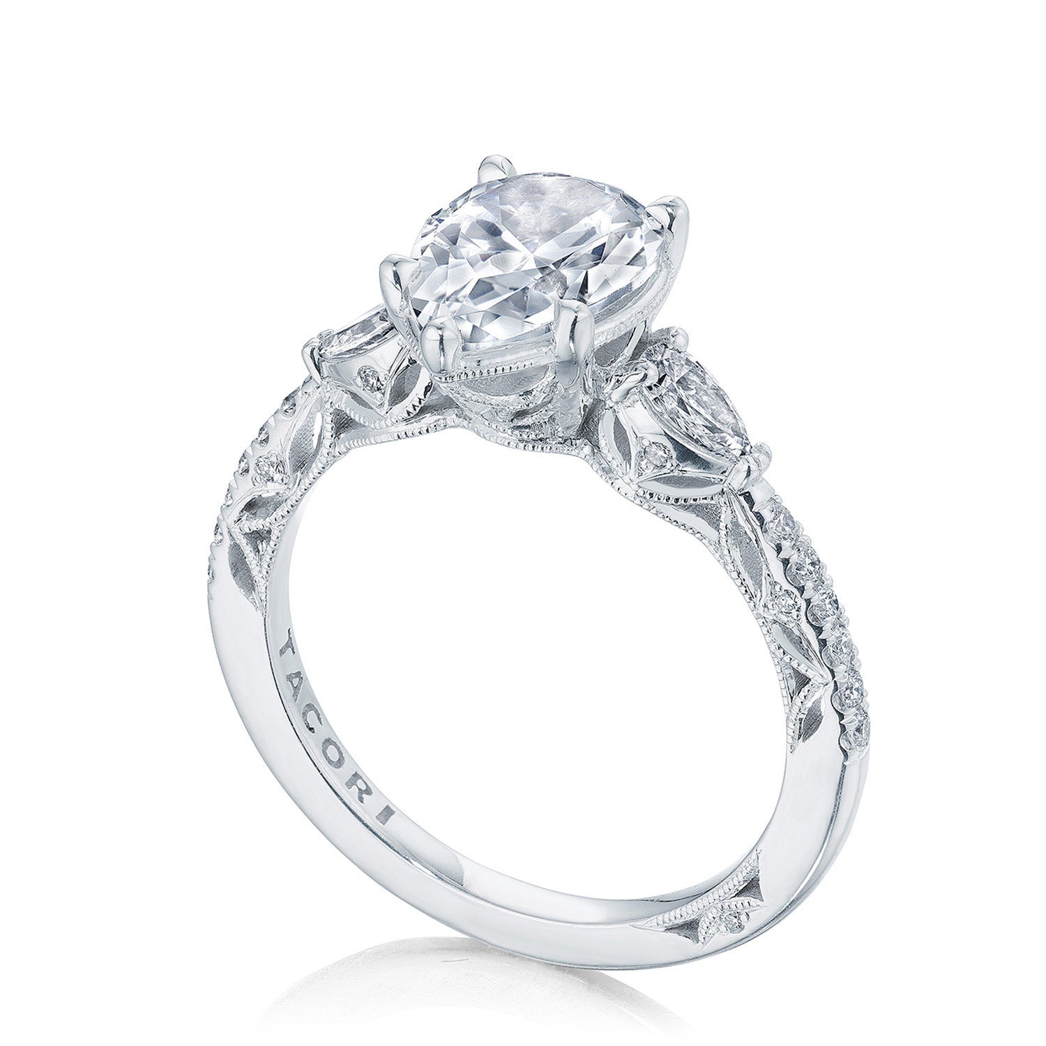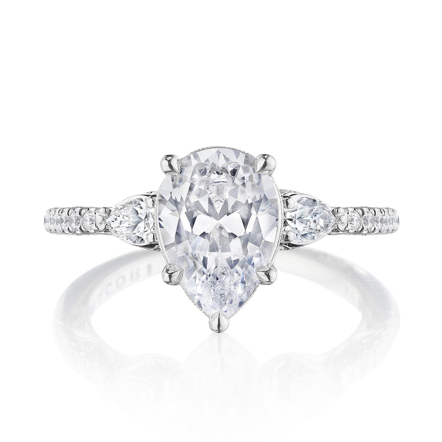 This three stone ring features distinctive pear side stones that sit atop a lace-like crown and foundation of complex, milgrain-edged Dantela Crescent Fabric. Meticulous, hand-set French pavé leads up the ceiling for eye-catching brilliance.