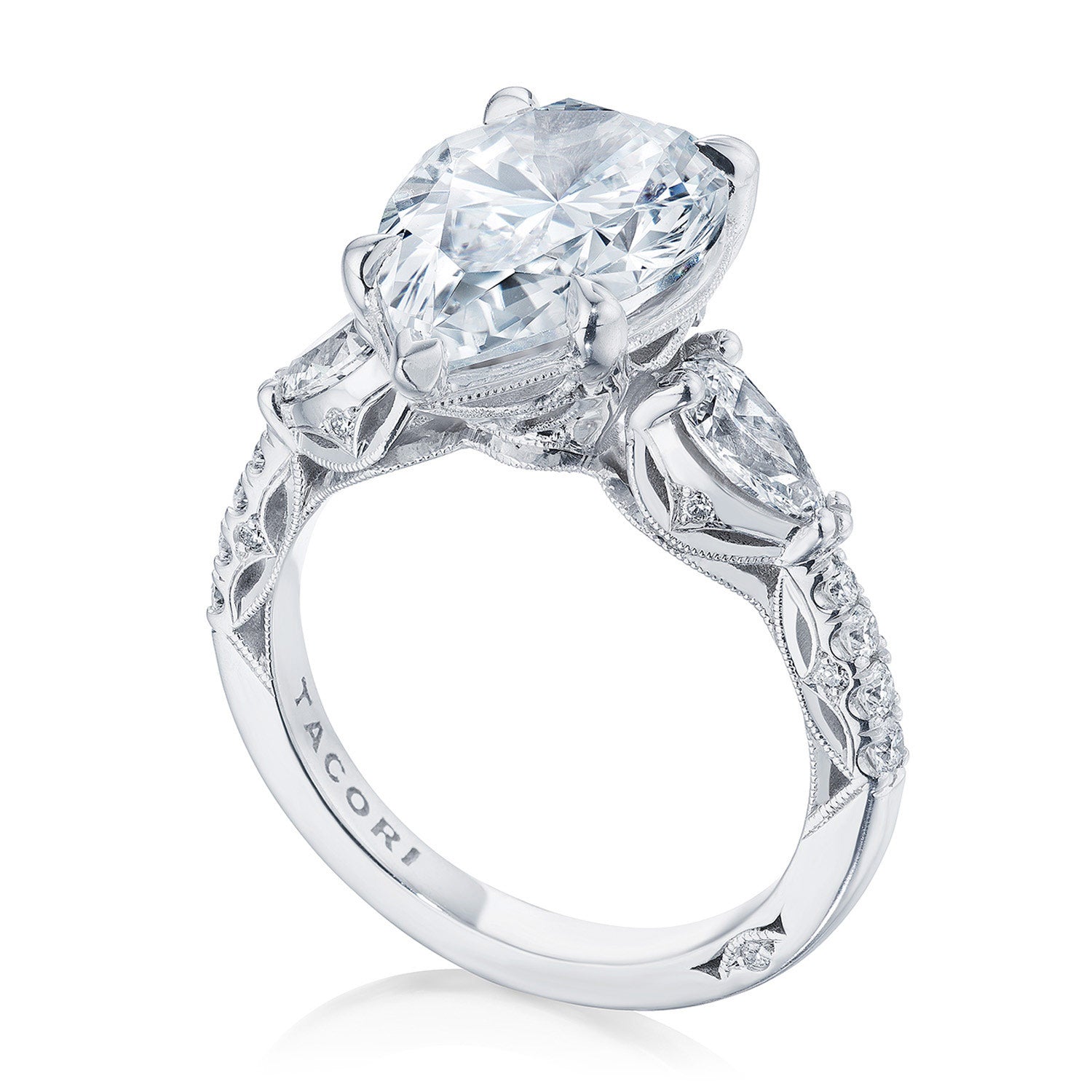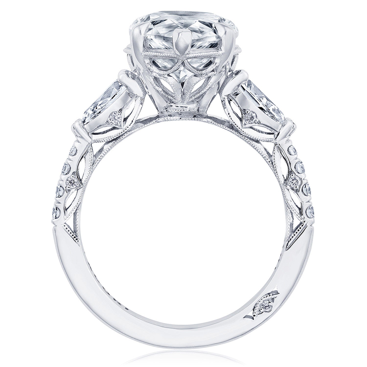 This three stone ring features distinctive pear side stones that sit atop a lace-like crown and foundation of complex, milgrain-edged Dantela Crescent Fabric. Meticulous, hand-set French pavé leads up the ceiling for eye-catching brilliance.
