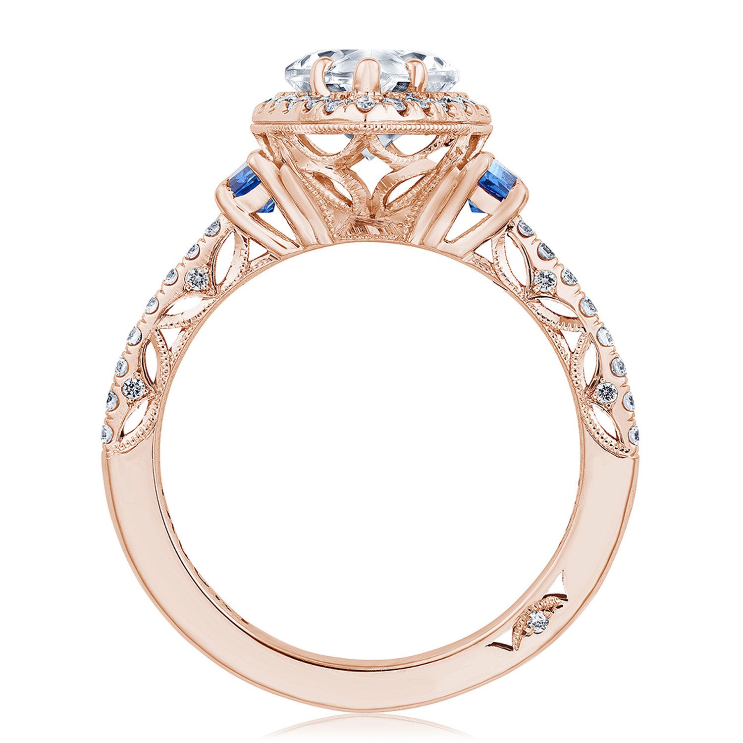 This elegant three-stone setting is exceptionally detailed. A Spotlight Bloom with blue sapphire Cadillac-cut side stones sit atop a meticulous French pavé band enhanced by the lace-like, Dantela Crescent Fabric.