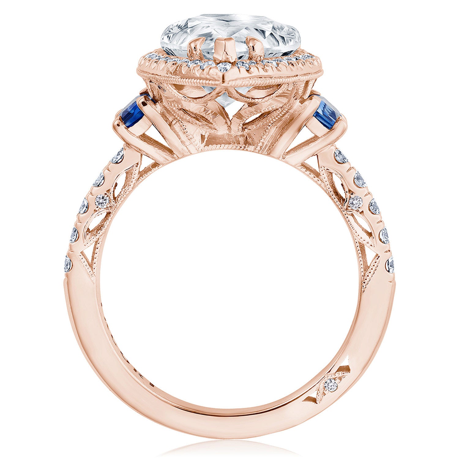 This elegant three-stone setting is exceptionally detailed. A Spotlight Bloom with blue sapphire Cadillac-cut side stones sit atop a meticulous French pavé band enhanced by the lace-like, Dantela Crescent Fabric.