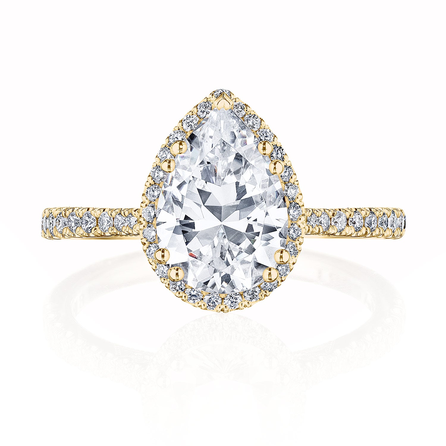 A thin, Simply Tacori Cathedral foundation that delivers brilliant detail, crowned with a pear cut center and pear shaped bloom. Truly Tacori and totally lovely.