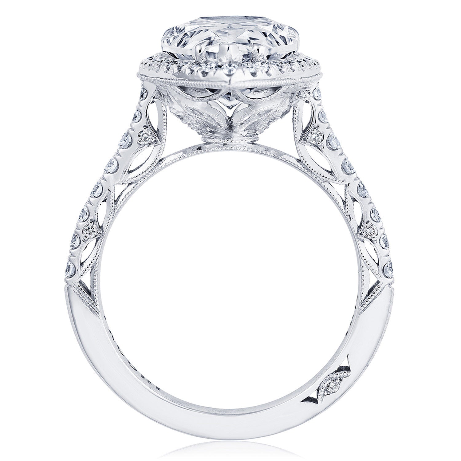 A subtle Spotlight Bloom encircles the center stone, and more brilliance is added by the meticulous French pavé that leads up the ceiling. A lace-like Crescent Fabric, edged with milgrain, gives stunning texture to the inner face profile.