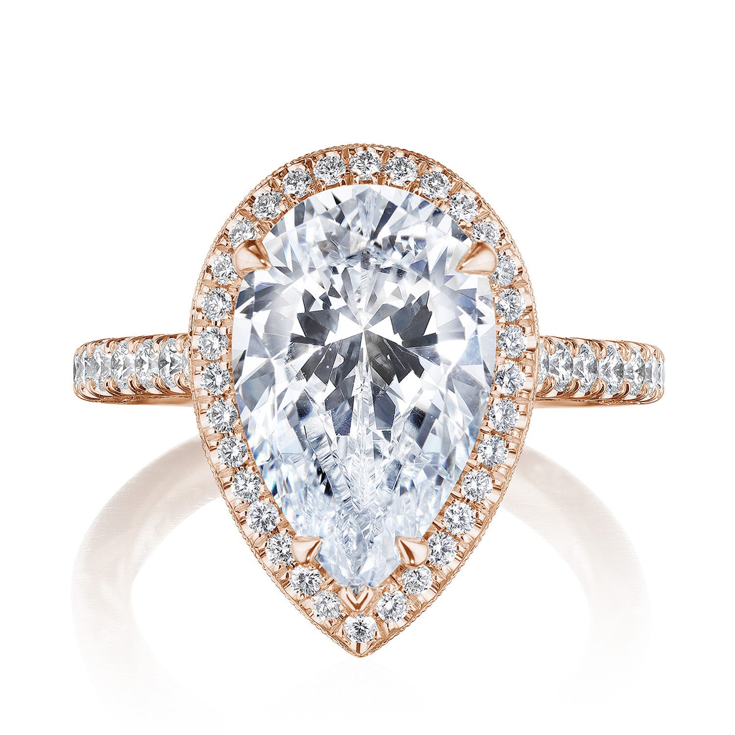 A subtle Spotlight Bloom encircles the center stone, and more brilliance is added by the meticulous French pavé that leads up the ceiling. A lace-like Crescent Fabric, edged with milgrain, gives stunning texture to the inner face profile.