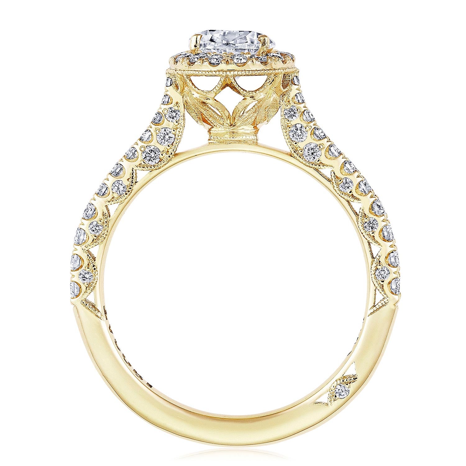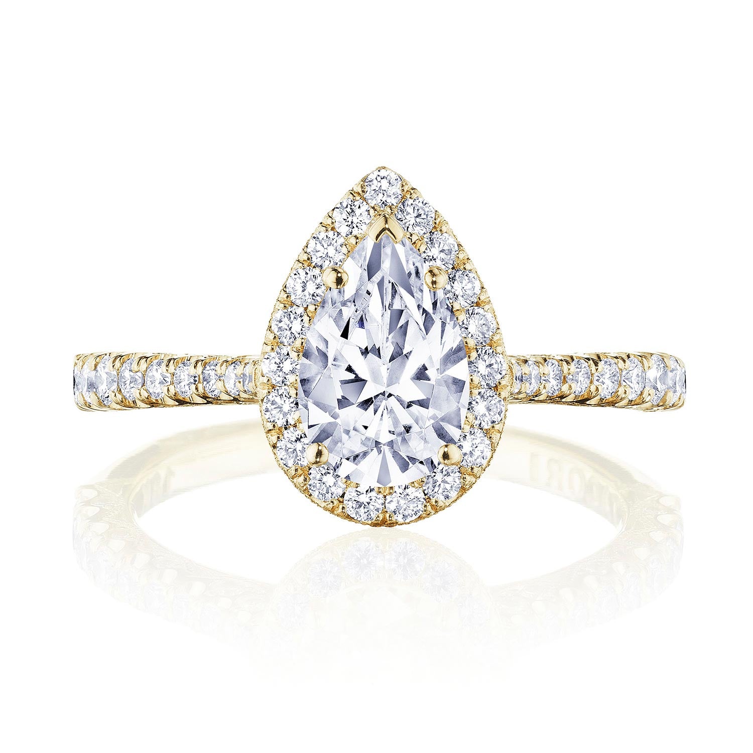 A diamond-intense Petite Crescent foundation with a lace-like Dantela crown and pear-shaped bloom. Graduating diamonds on the band taper towards the center, adding the perfect touch of classic elegance.