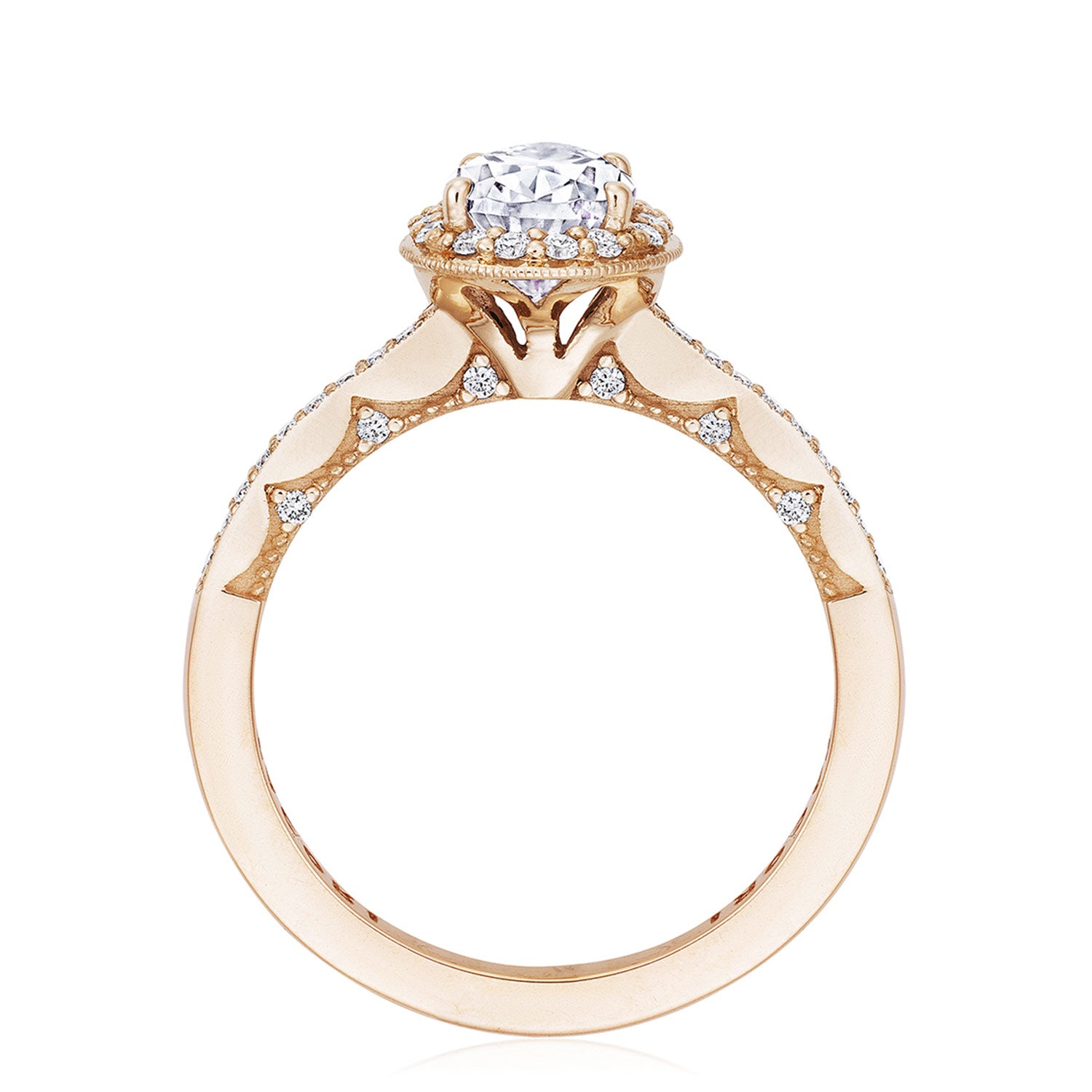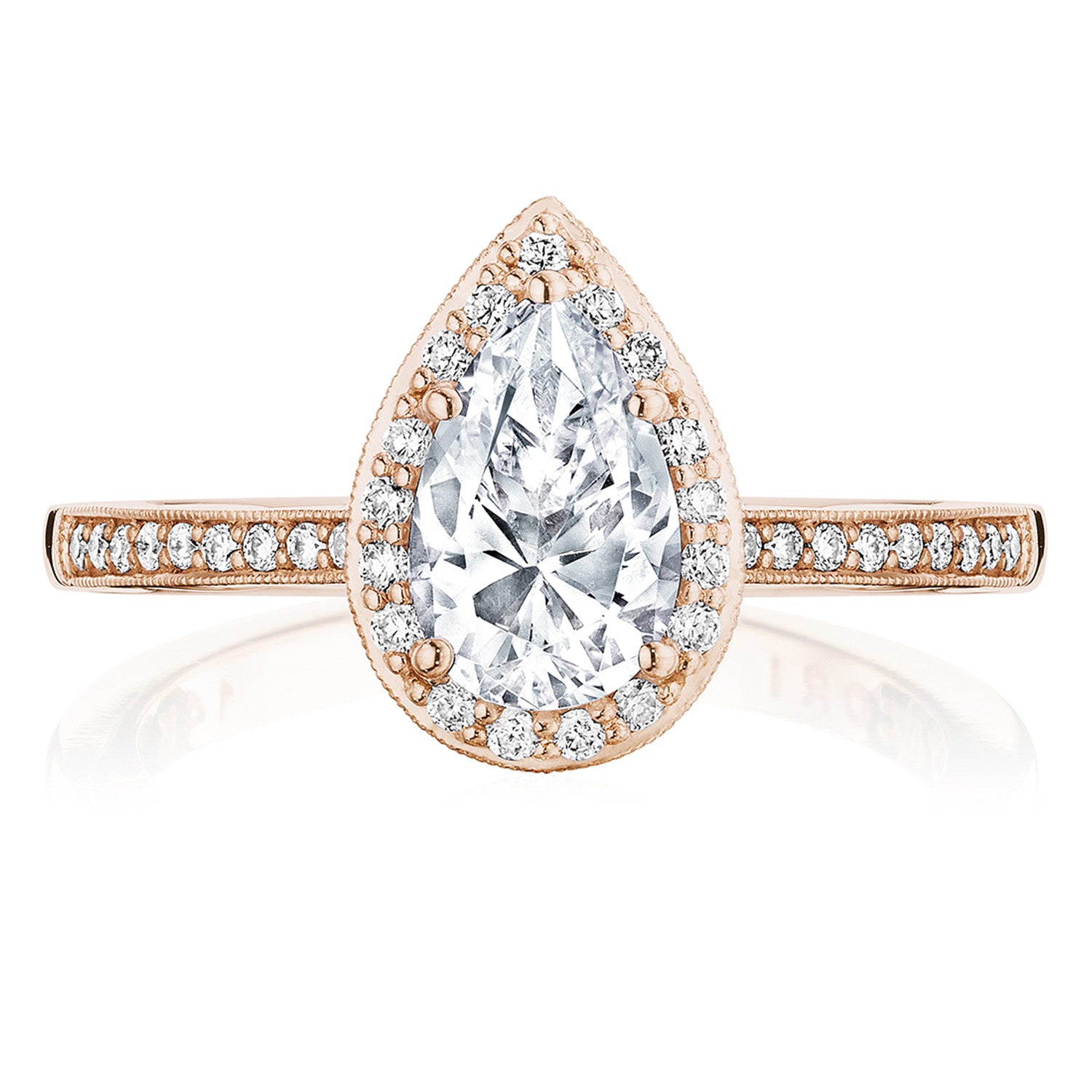 A pear shaped diamond solitaire is brought to life by a crown of diamonds and rests gently on a diamond band. This ring features the Coastal Crescent inner face with pinpoint diamond details for a truly regal look.